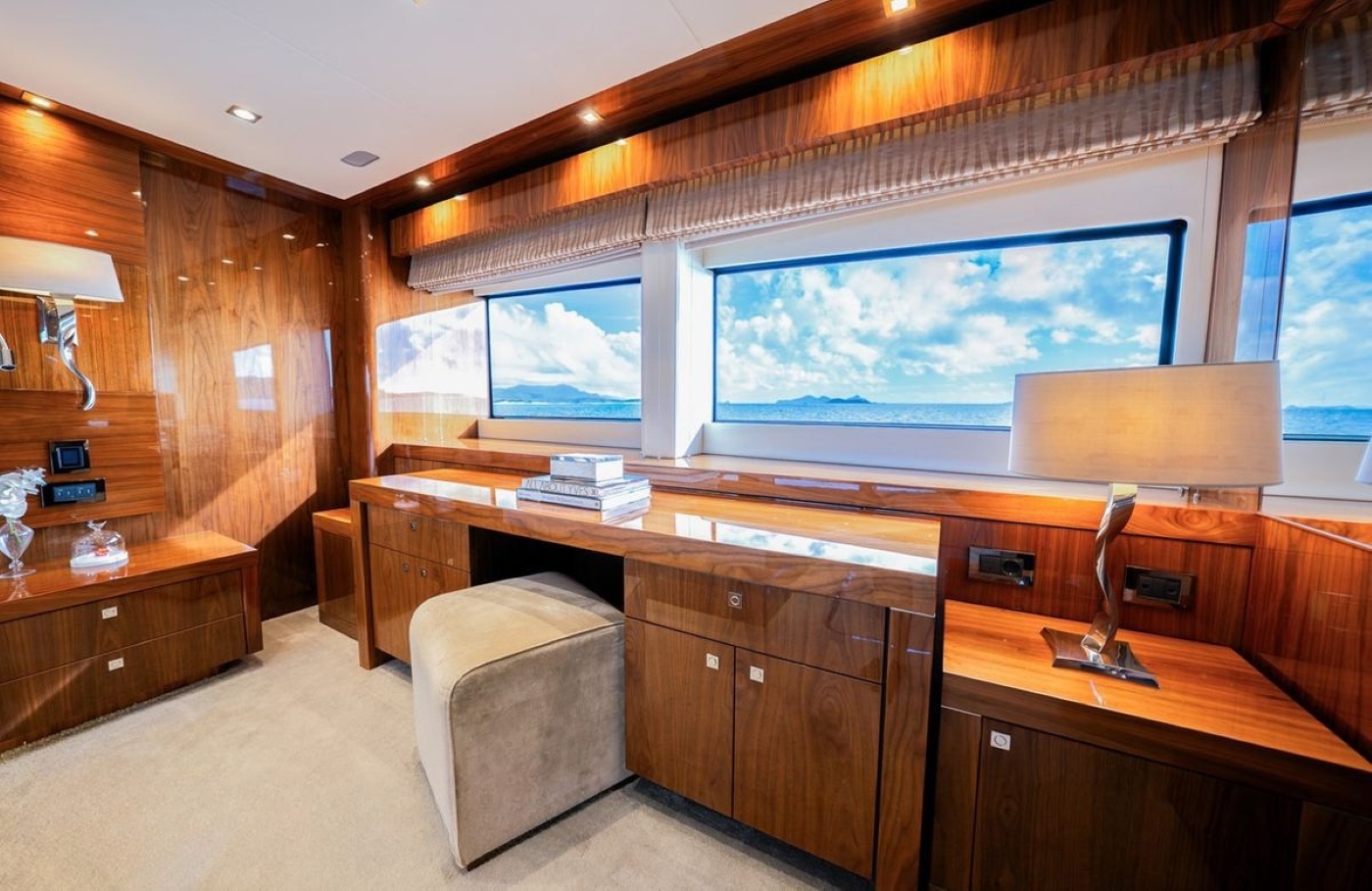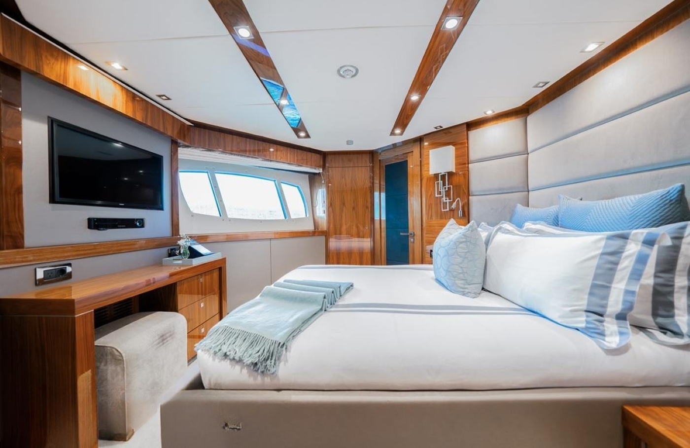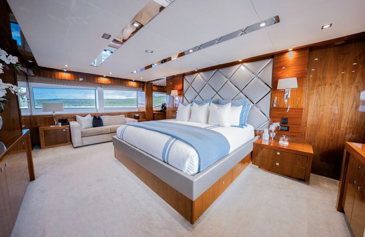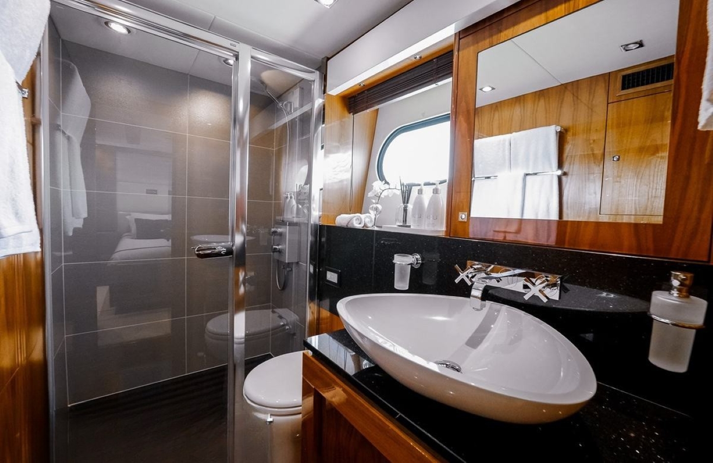 Settlement offers five deluxe staterooms, including one master suite on the main deck spreading the entire beam of the yacht with a lovely king-sized bed, an ensuite bathroom with a shower and spa, toilet and his and hers sinks. There are two additional queen-bedded cabins each with walk-in wardrobe and ensuite bathrooms with shower, as well as two double/twin cabins, each with two single beds and ensuite with a single sink. Each cabin has a hairdryer and Aesop guest toiletries.