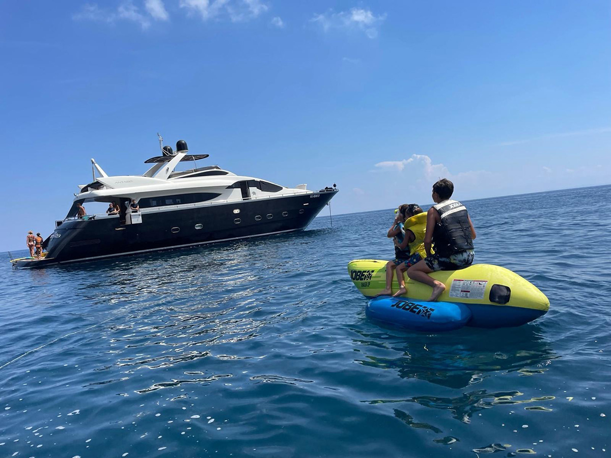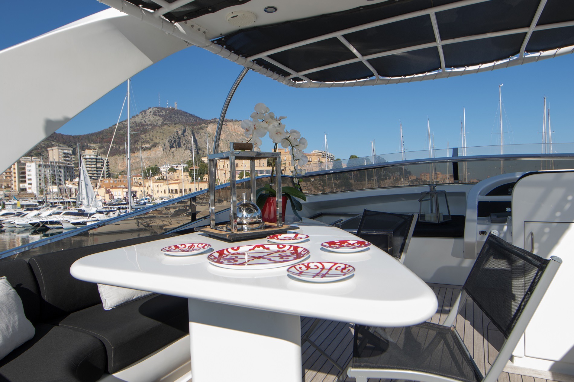 ~Williams 110 HP Seasport deluxe 3,85 m Jet tender*, ~Waverunner Seadoo GTSE with 130 hp (new in 2018)*, ~1 x Inflatable Kayak, ~1 x stand up paddle board, ~2 x seascooter Yamaha RS 280, ~Jobe Chaser 4, ~8 x Snorkeling Equipment, ~Donut, ~Banana, ~Floating chairs, ~Fishing Rods. * The yacht can provide either tender or wave runner. There is no space to keep both on board. Clients need to advice before the charter which they would prefer to have on board. ~Communications HP Photo Smart 3310 Printer/Fax Raymarine GPS receiver GP 320 B Raymarine VHF radiotelephone - Model FM 8800D/ 8800 S on Flybridge Raymarine VHF radiotelephone - Model FM 8800D/ 8800 S in Bridge Panasonic telephone system digital super Ibrido ~Audio Visual Equipment and Deck Facilities Master suite: Telefunken HD redy 32". Skybox decoder. Bose lifestyle. Humax decoder (connecting satellite to saloon), DVD Sharp. VIP suite: Sharp/Aquos LC 26". Bose 321. Humax decoder (connecting satellite to saloon) 2 Twin cabins: Sharp/Aquos LC 26". Bose 321. Humax decoder (connecting satellite to saloon) Saloon: Sony Television LC 42. Sky decoder with card. DVD and decoder. Bose life style Flybridge: Exterior speakers with connection to the Bose. (inkl. bar/icemaker/BBQ) Aft deck: Exterior speakers with connection to the Bose life style in the saloon. Italian Sky TV and Pod Docking station Pioneer. ~Deck facilities: Sunbathing area fwd Sunbathing area, dining table, BBQ and fixed bimini on the flybridge Day head on main deck Expandable dining table on aft deck Yacht has FIX fins