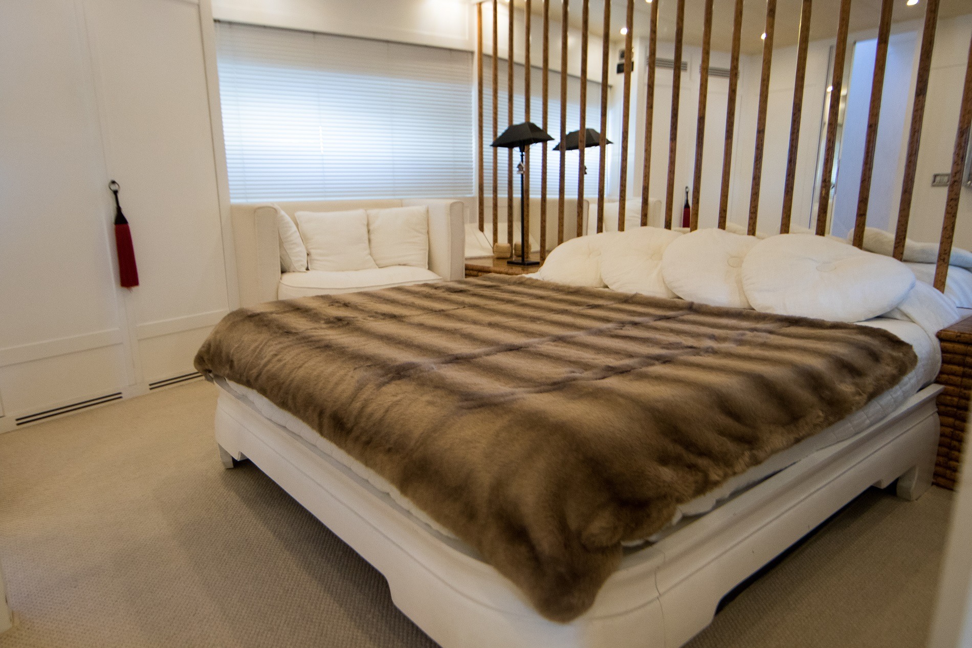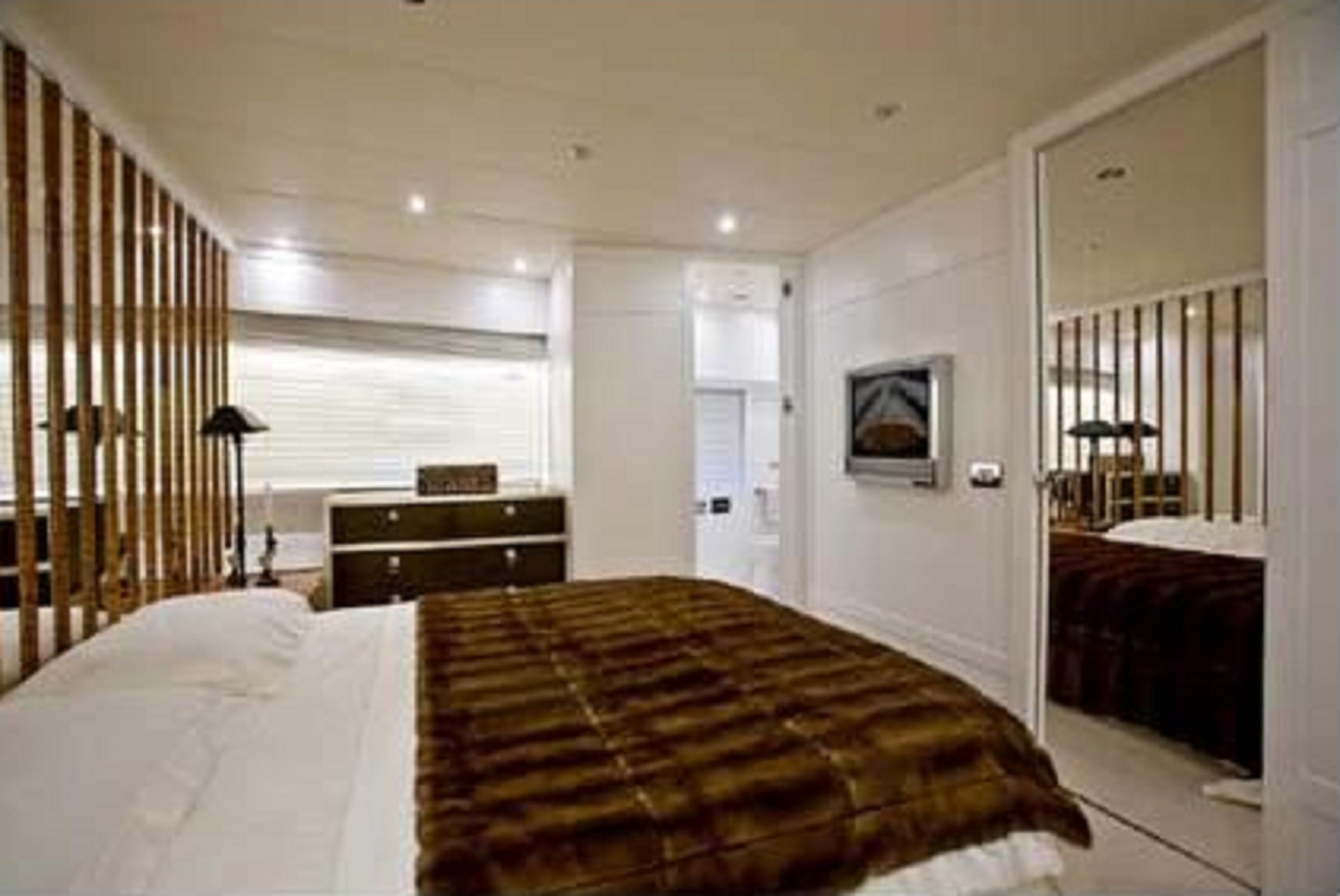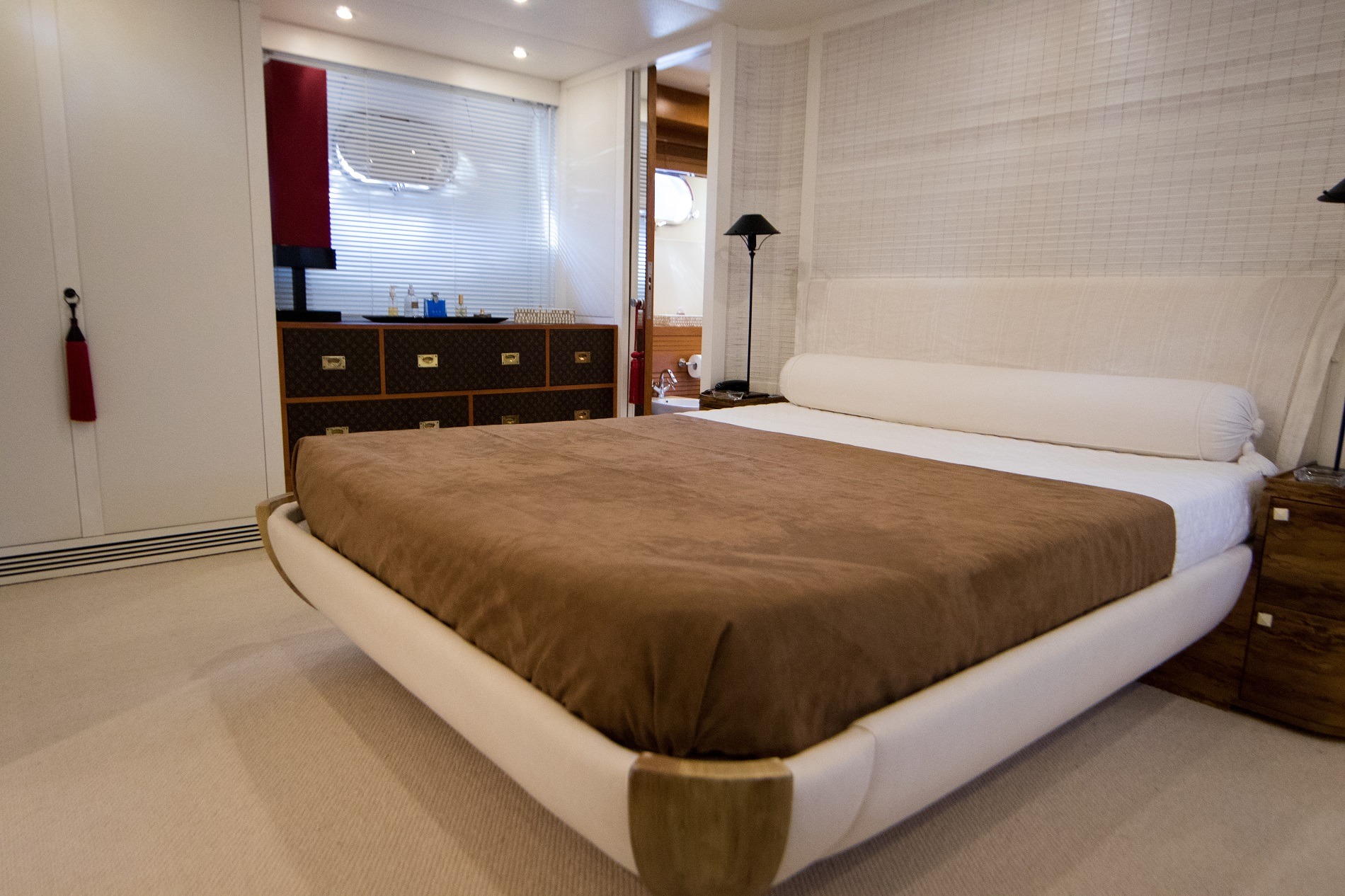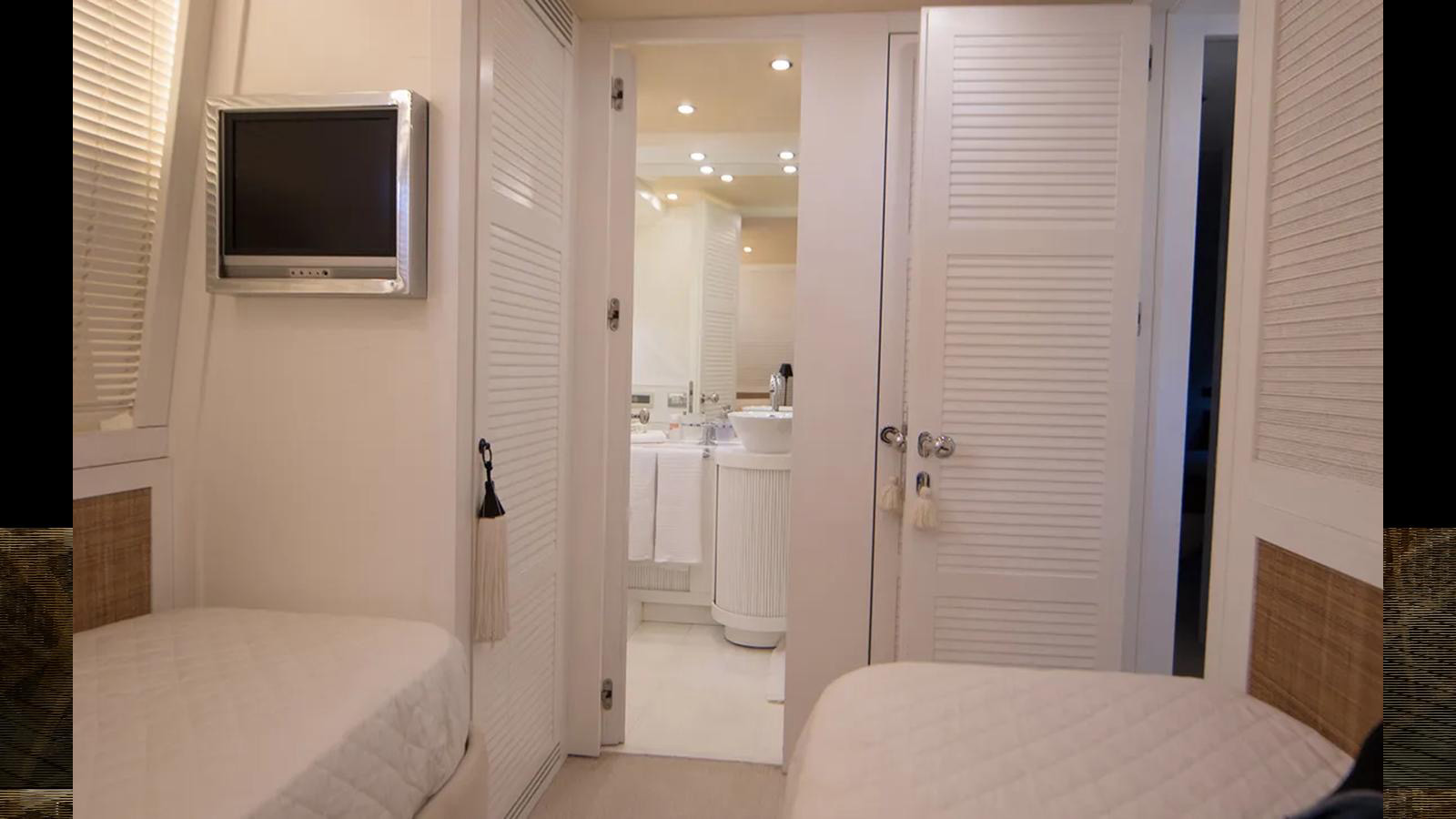 Lower deck: Full beam Master cabin aft featuring a bathroom with bath tub, Amidships: Port 1x twin cabin and STB 1x twin cabin, Forward: Double VIP Cabin. Bed sizes in master and VIP cabin 1.60 x 1.90 m, twin cabins: 0.70 m x 1.90 m. Master cabin & VIP cabin are equipped with a beverage fridge in the bathroom. All bathrooms are equipped with a bidet and hairdryers.