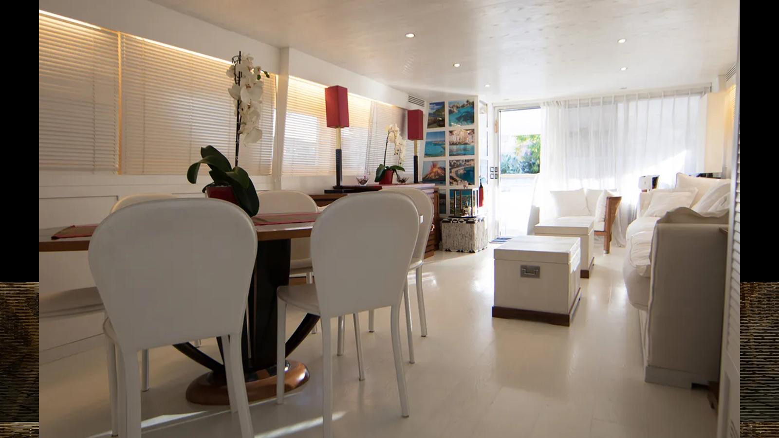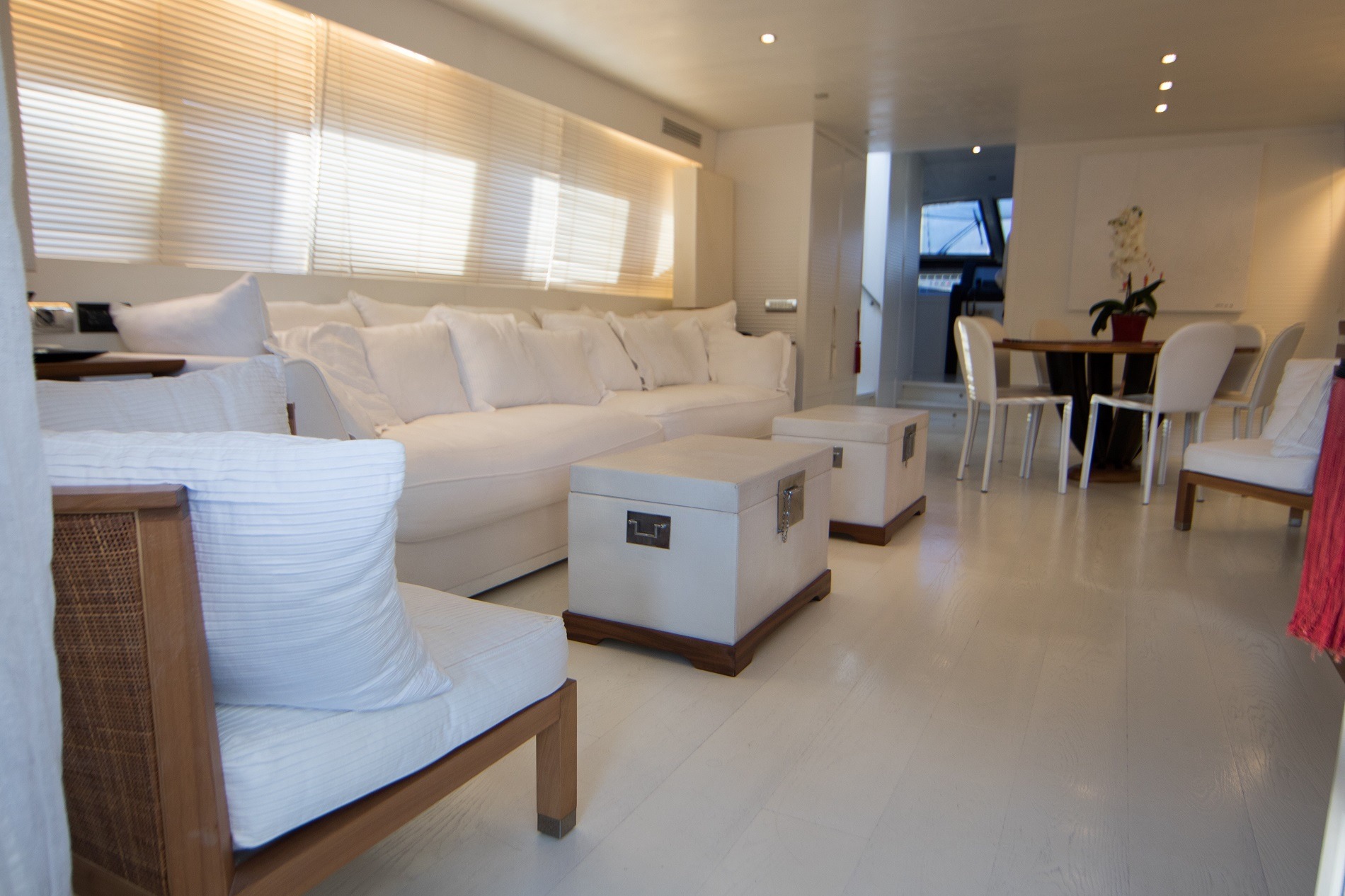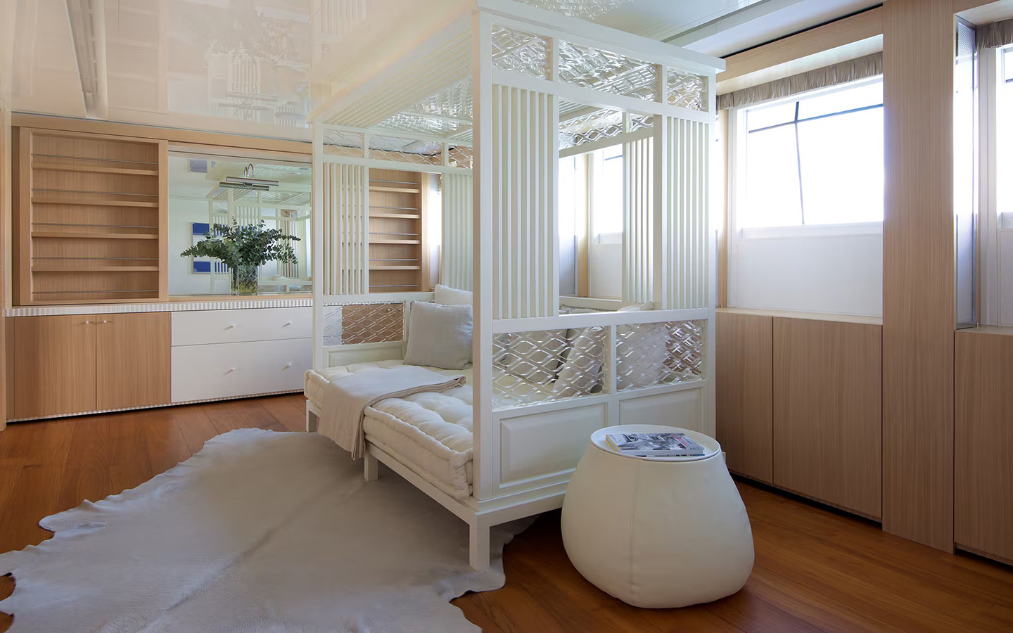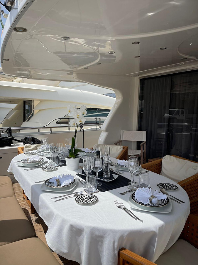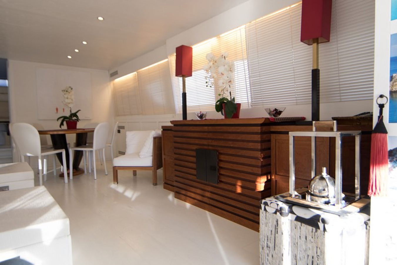 Inside, SEVEN STARS showcases a light and airy ambience with subtle Far Eastern influences. White oak panelling and floors contrast with dark wood furnishings and soft white upholstery, creating a relaxed beach house atmosphere. Decorative bamboo accents, Chinese wallpapers, and curated deco pieces add character and texture. The main salon, flooded with natural light through expansive windows, features a lounge and dining area finished with a Bose lifestyle system and Italian Sky TV. This seamless blend of style and function invites effortless indoor living.