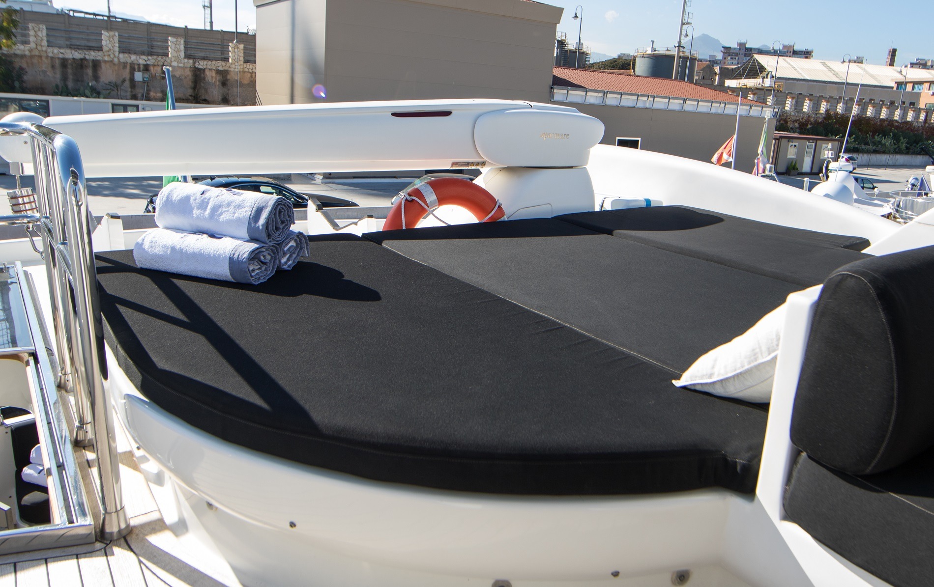 SEVEN STARS offers numerous al fresco spaces across her decks for unwinding and socialising. The aft deck opens into a welcoming lounge area perfect for morning coffee or evening aperitifs. Forward on the bow, a private sunbathing area invites peaceful relaxation with open sea views. The flybridge is the yacht’s outdoor hub – featuring a large sofa with dining table, BBQ grill, icemaker, and dedicated sunbathing space, all enhanced by a high-quality sound system. Down at sea level, the bathing platform ensures smooth access to the water and makes an ideal base for water sports.