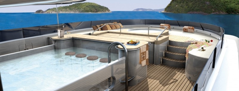 Heinen & Hopman is the type of air conditioning system employed in the interior. This motor yacht has a teak deck.