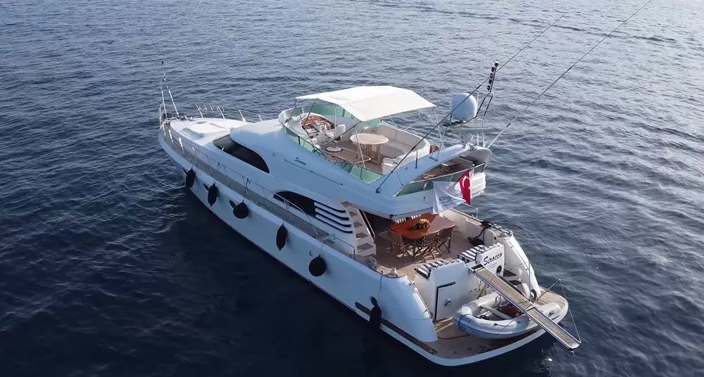 NOTABLE FEATURES OF SIROCCO: ~Flybridge with soft bimini shade ~Aft deck dining area ~Foredeck sun pads ~Lovely interior ~Air conditioning ~WiFi