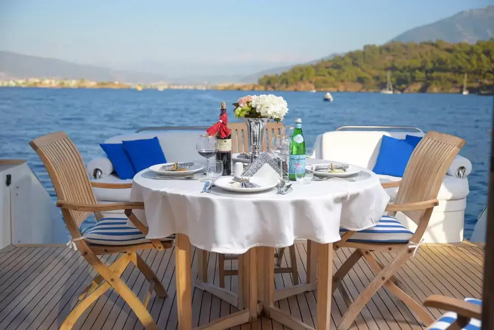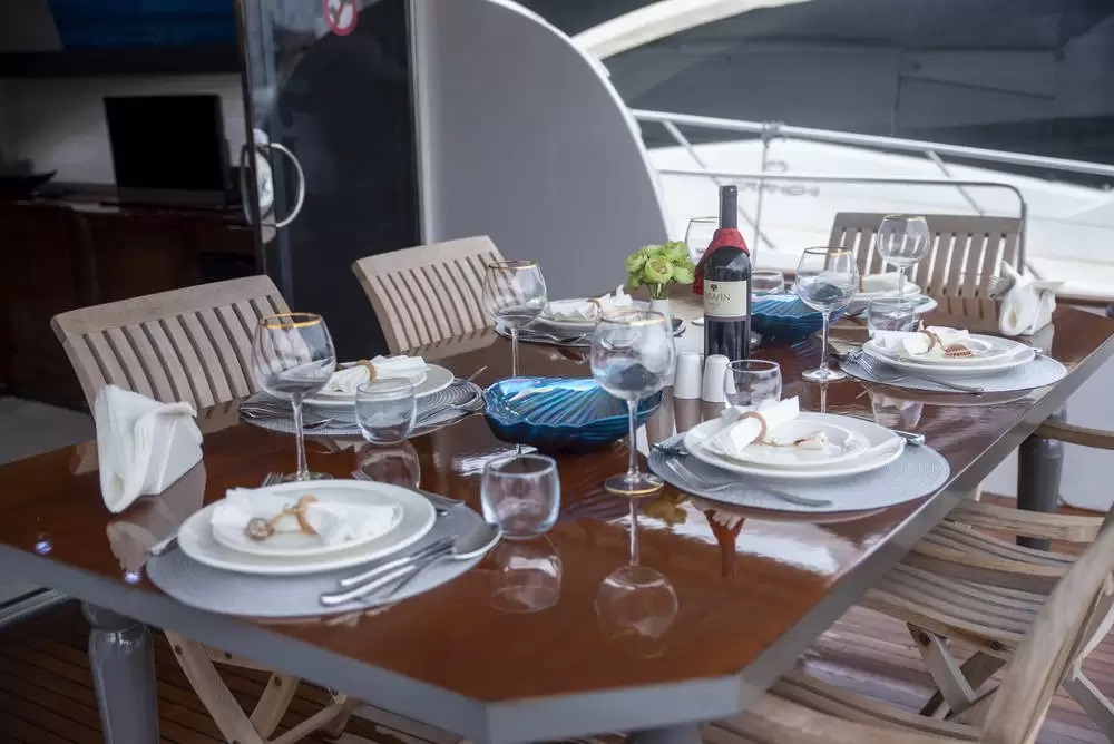The flybridge deck has a comfortable sofa which curves gently into the starboard side around a moveable table. There is a helm station forward and the deck can be covered with a soft bimini while access is up or down steps to port. Once on the main deck aft guests will be delighted to find a 6-seater dining table and 2 forward-facing sofas. Steps descend to the waters-edge swim platform and the side deck leads around to the foredeck and its double sun pad.