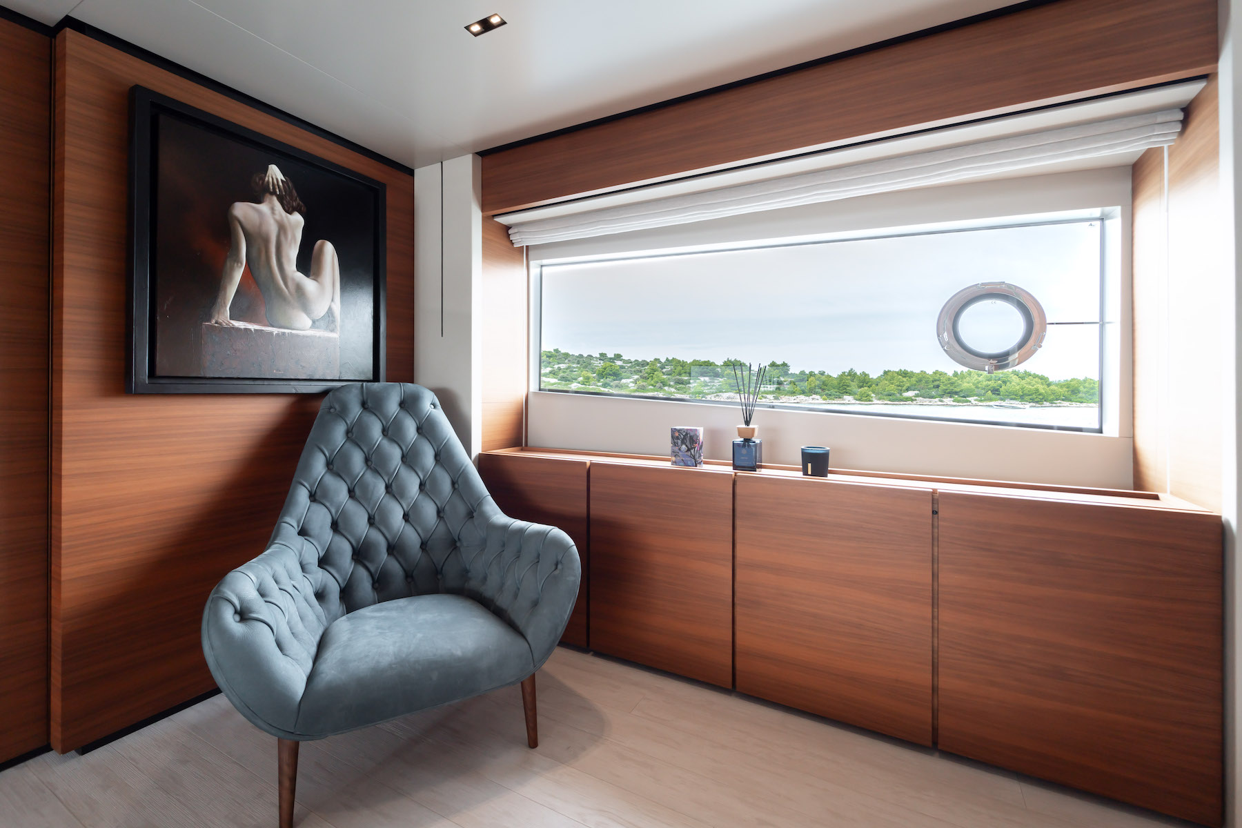 The guest suites are configured as a main deck master and four lower deck suites, all with the luxury and privacy of ensuite bathroom facilities. The main deck master boasts a walk-in-wardrobe, vanity and desk space plus his-and-hers ensuite bathrooms with a central shower cubicle. Three doubles and one twin – with additional pullman bunk – complete the guest accommodation below deck.