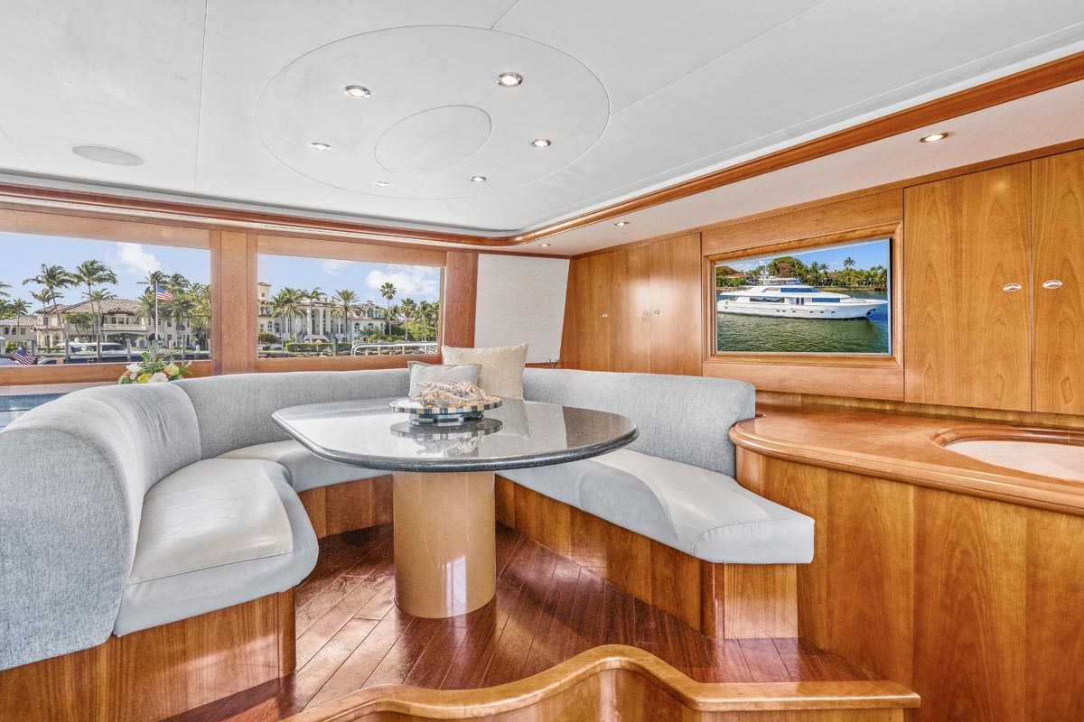 Luxury yacht SLEEPOVER boasts expansive outdoor living areas. The large flybridge is a standout feature, offering a custom hardtop, wet bar, Jacuzzi, and a generously sized dining setting for al fresco dining. The aft main deck offers an additional dining setting with a comfortable u-shaped sofa and chairs surrounding a flexible table. The deck also features a sit up bar, perfect for sipping a glass of champagne while enjoying the views.