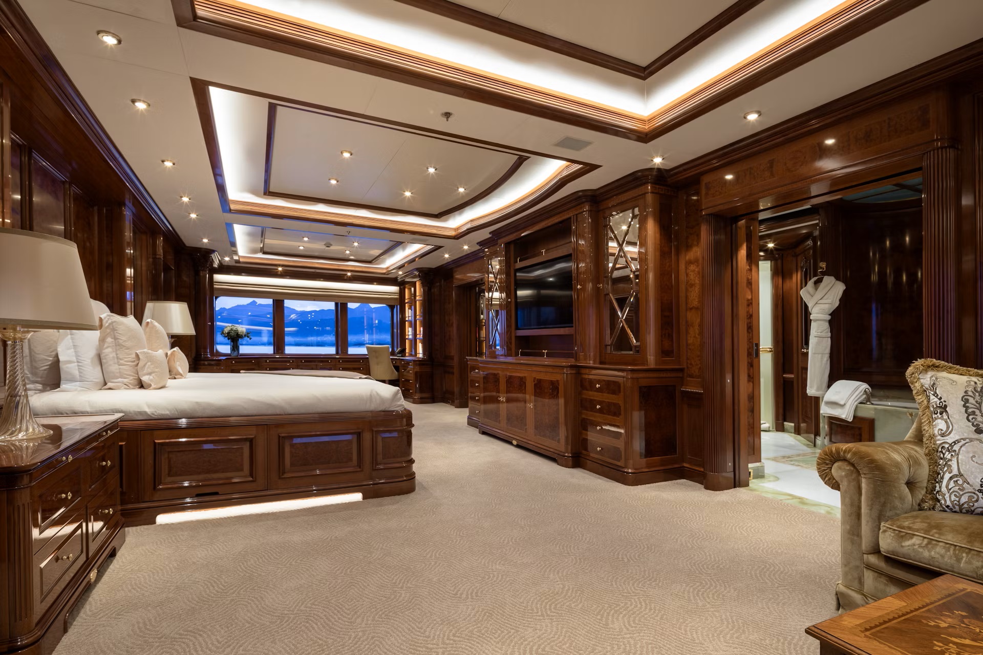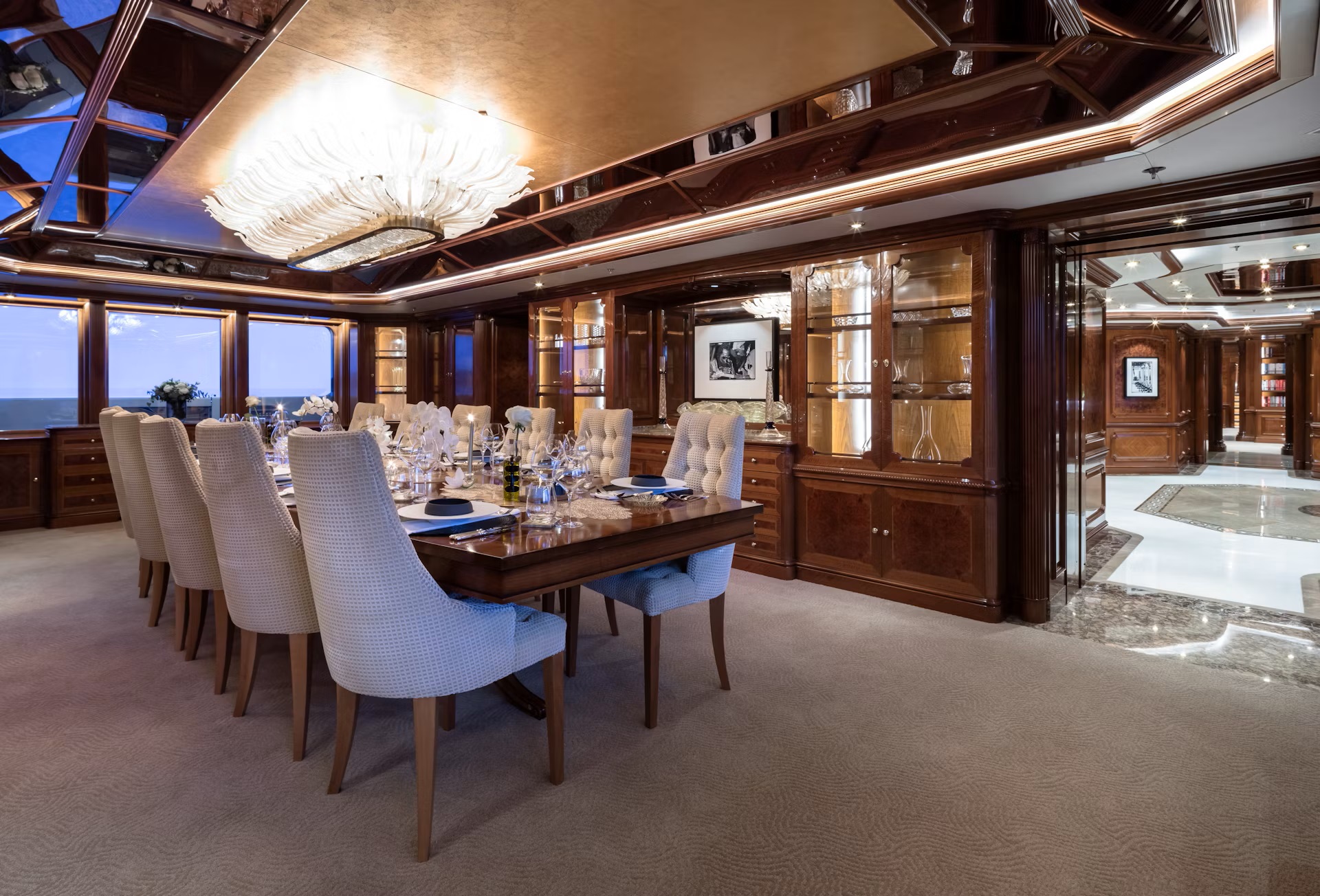 The main salon leads in from the aft deck and is a formal lounge space with an arrangement of sofas and armchairs, a games table and sit up bar. Gloss wood display cabinets house the impressive collection of crystal glassware, enhanced by elegant down lights creating a grand atmosphere. Forward from the main salon finds the formal dining room which is a glamorous space for guests to host fabulous dinner parties. The main foyer is amidships leading on to the master suite.