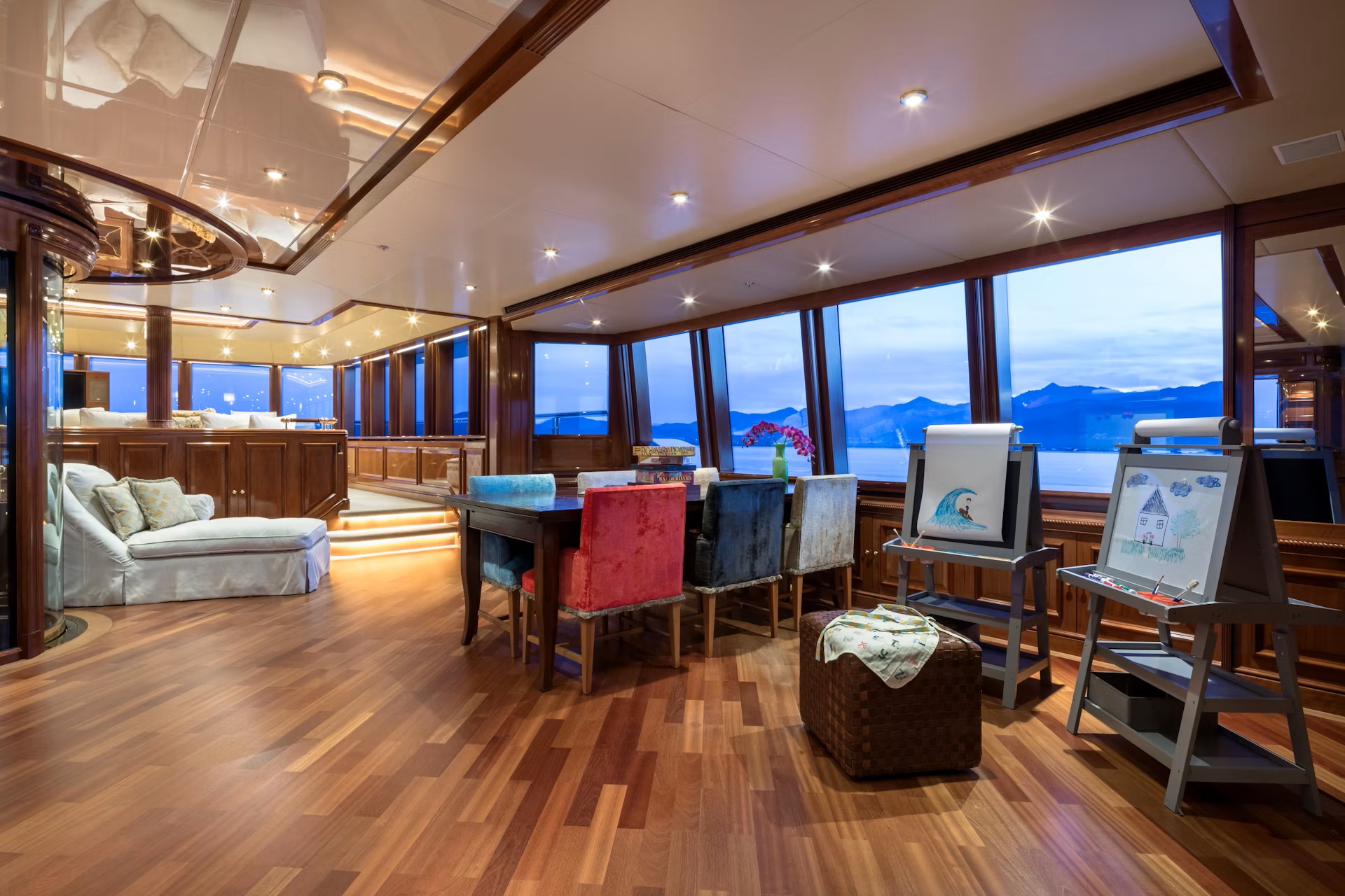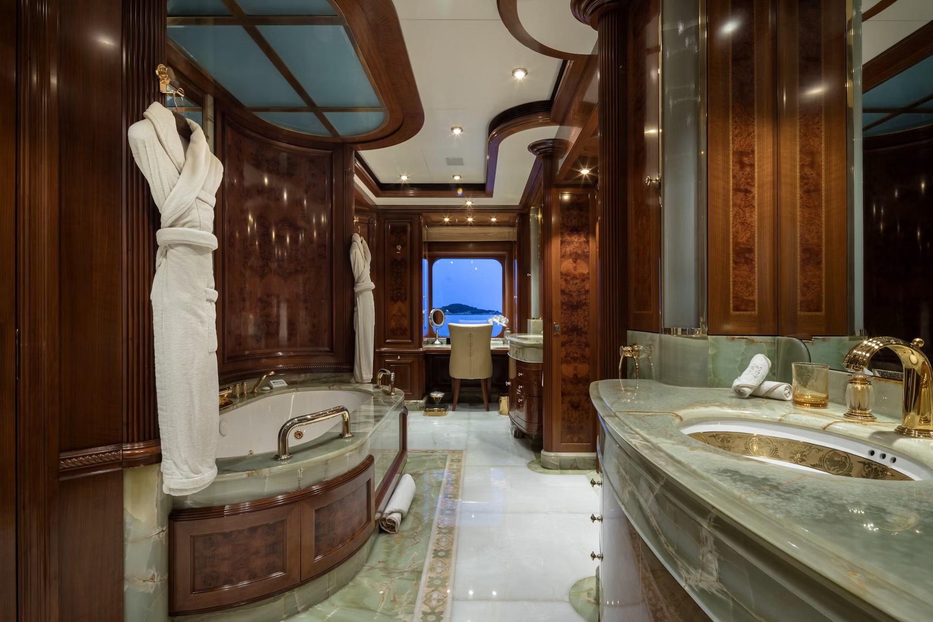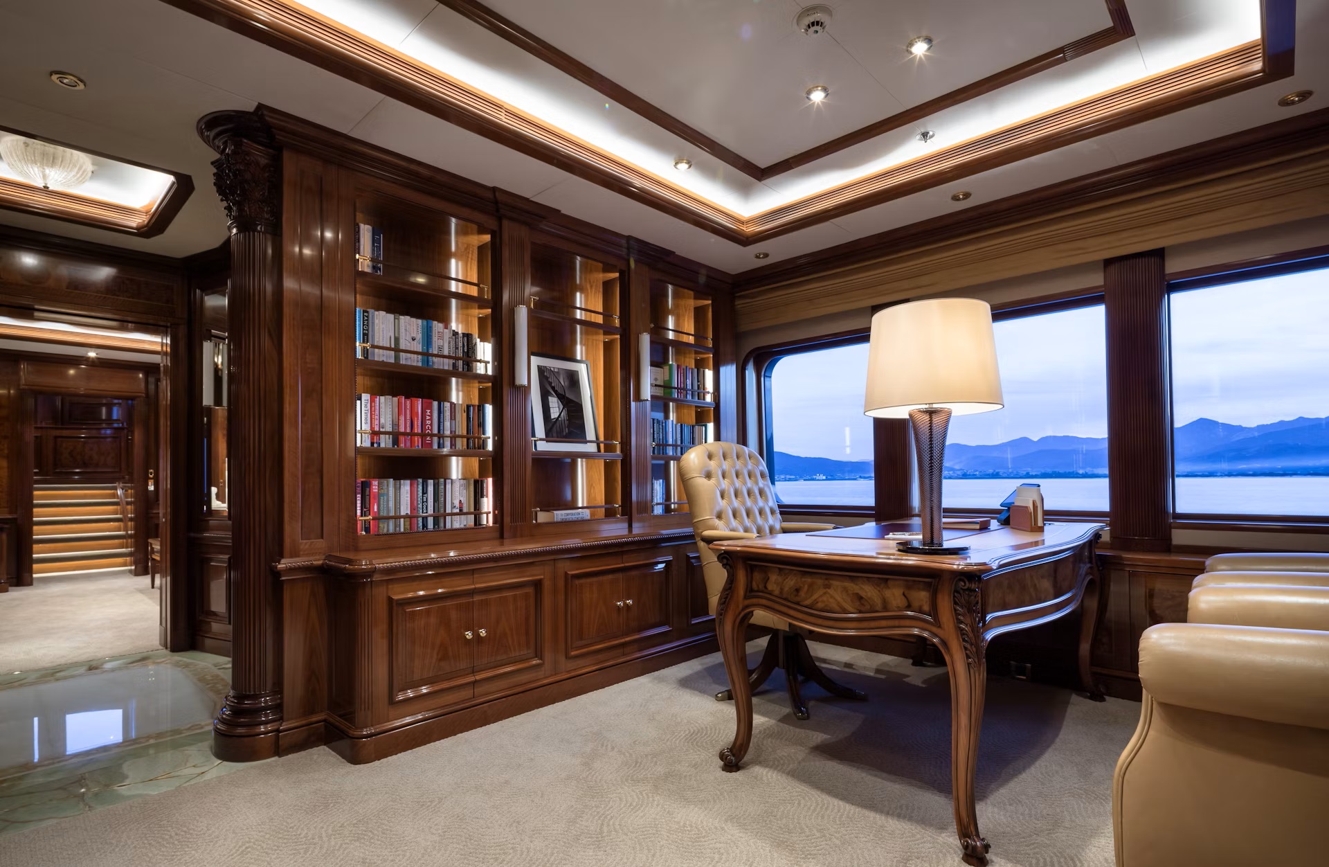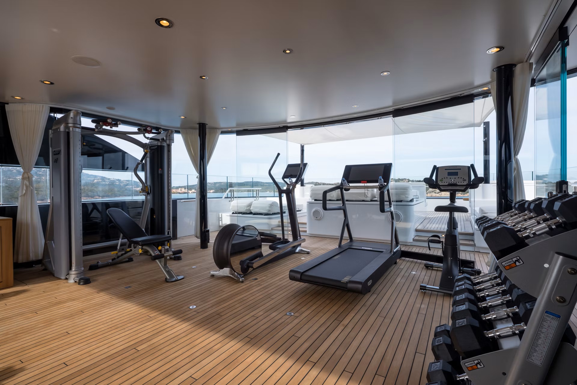 The exceptional accommodation is spread across seven cabins for up to 12 guests in as many as 16 sleeping locations which can also accommodate nannies or other staff. The full-beam owner’s suite is a sanctuary, complete with a forward-facing private observation lounge, perfect for a quiet coffee in the morning, a massage in the afternoon, and a cocktail in the evening. A treadmill and Peloton are situated here, providing guests the option of exercising in the peace and comfort of their own cabin. There is a private office, a spa-like marble bathroom with a Jacuzzi tub, separate showers and toilets, and his-and-hers walk-in closets. The VIP suite on the bridge deck boasts stunning views, a spacious sitting area, and an elegant ensuite. Four additional guest cabins on the lower deck offer king-size beds, plush seating, and opulent ensuites, with two featuring hidden Murphy beds for additional flexibility. A beautifully finished twin cabin provides an ideal space for children or staff.