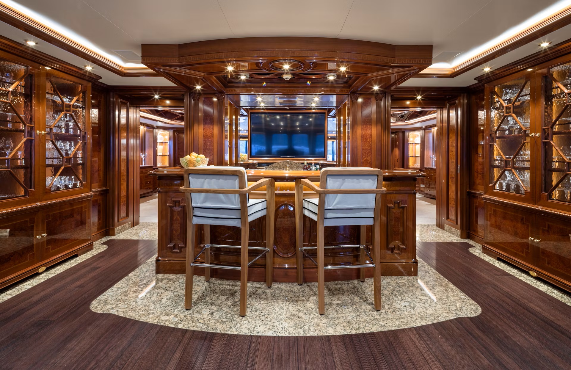 The bridge deck salon is truly unique and is set up like a traditional – but luxurious – pub. The sit up bar is adjacent to a seating booth, dart board and retro arcade game while a cinema area and casino table sit forward. Aft is a light and airy dining room with gently curving glass walls and doors leading onto the bridge deck aft.