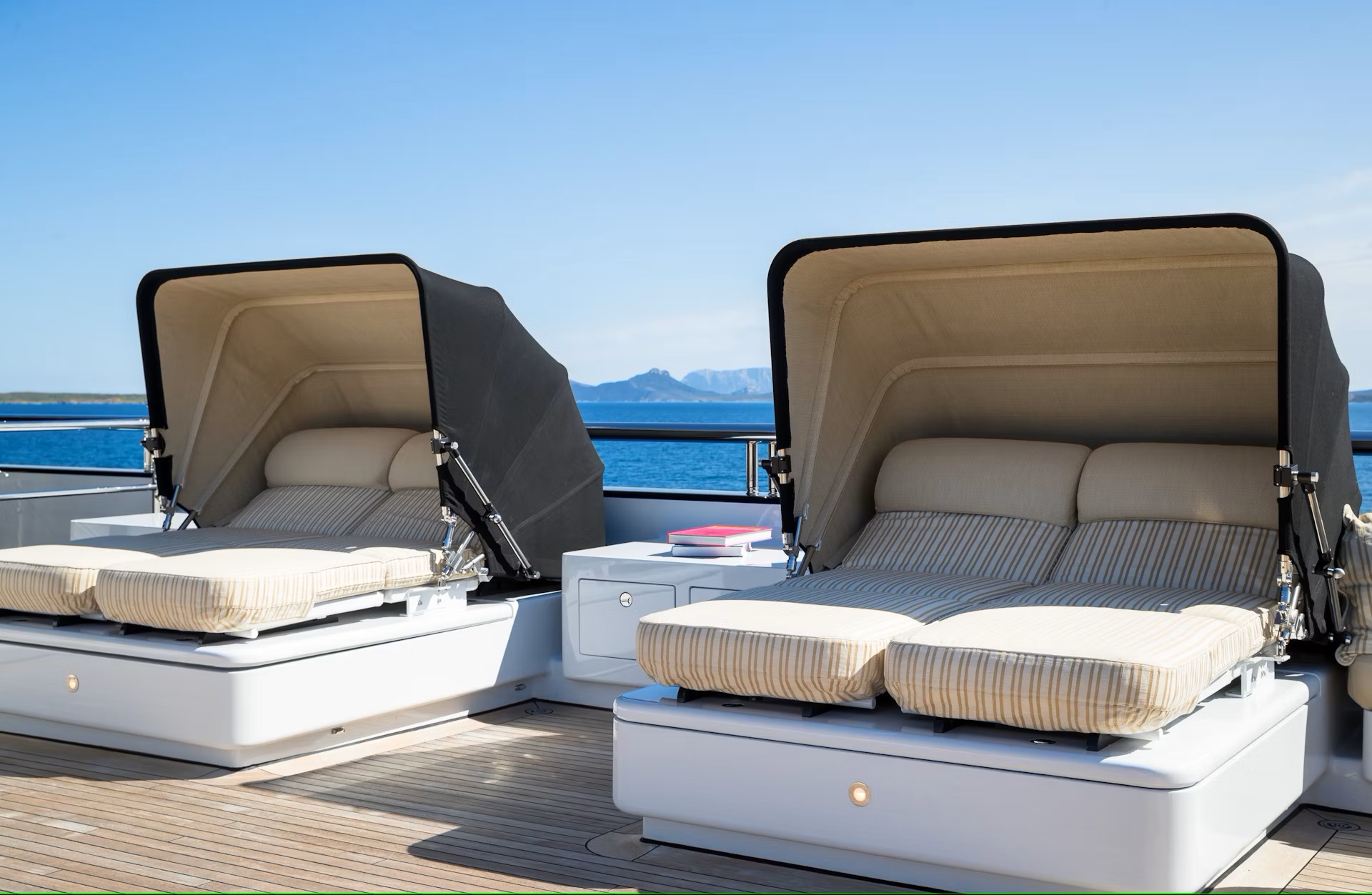 The sun deck is where guests can soak up the sun while relaxing on custom-made double sun beds with bespoke integrated canopy sunshades. When they need to cool off or fancy a swim there is a counter current pool with swim up bar which transforms into a jacuzzi with enough space for all 12 guests.