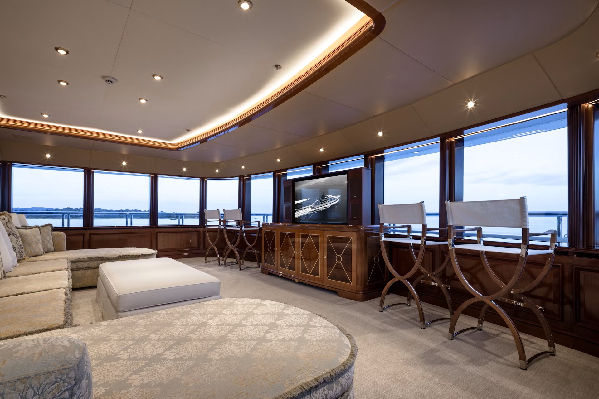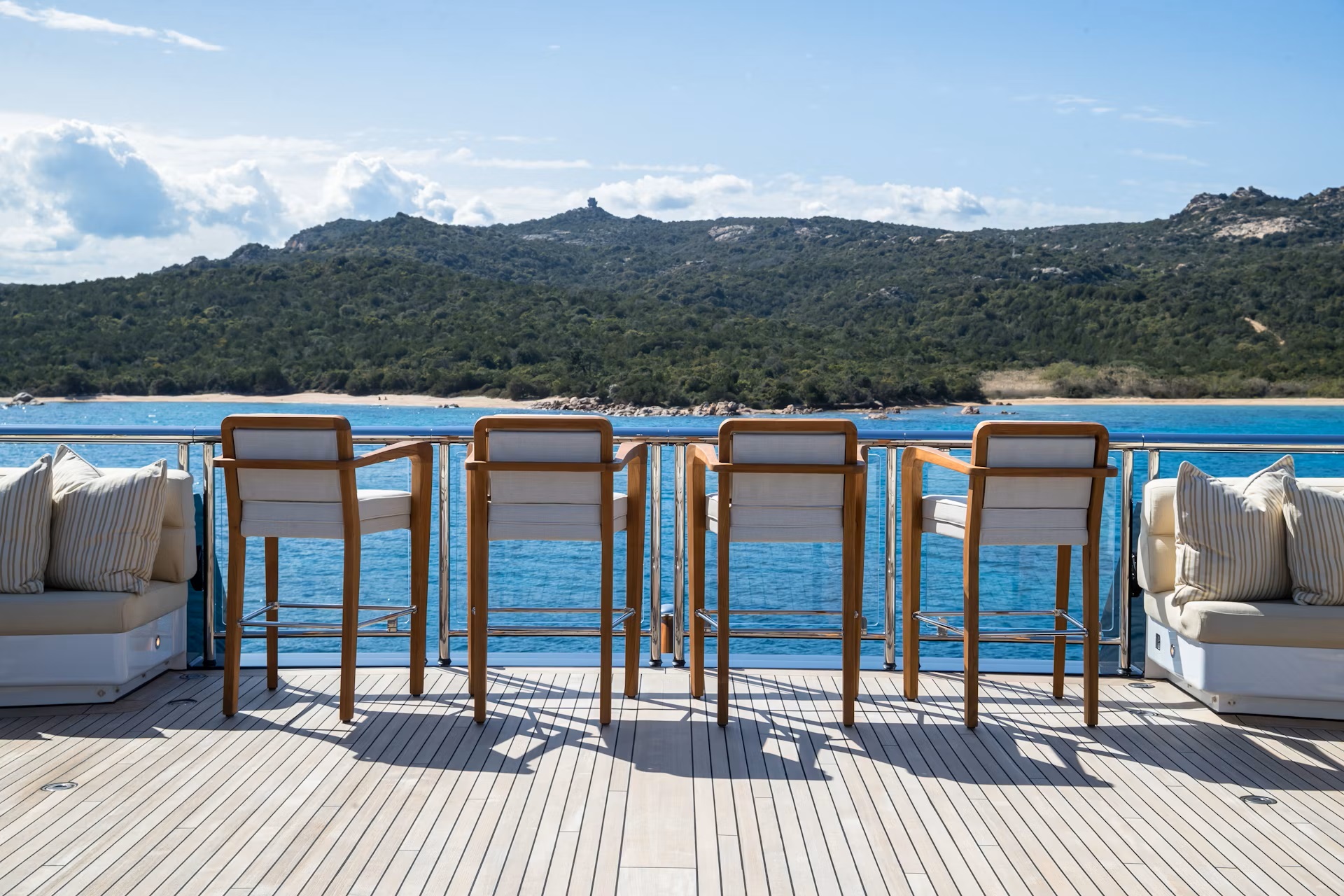 The bridge deck aft is dedicated to al fresco entertainment and includes a large dining setting and continues line of sofas wrapped around the deck. Spectacular views and shelter from the sun deck overhang make the area perfect for both casual dinners and special occasions. From the deck doors lead directly into the interior bridge deck dining salon allowing the space to be used as one large entertainment deck.