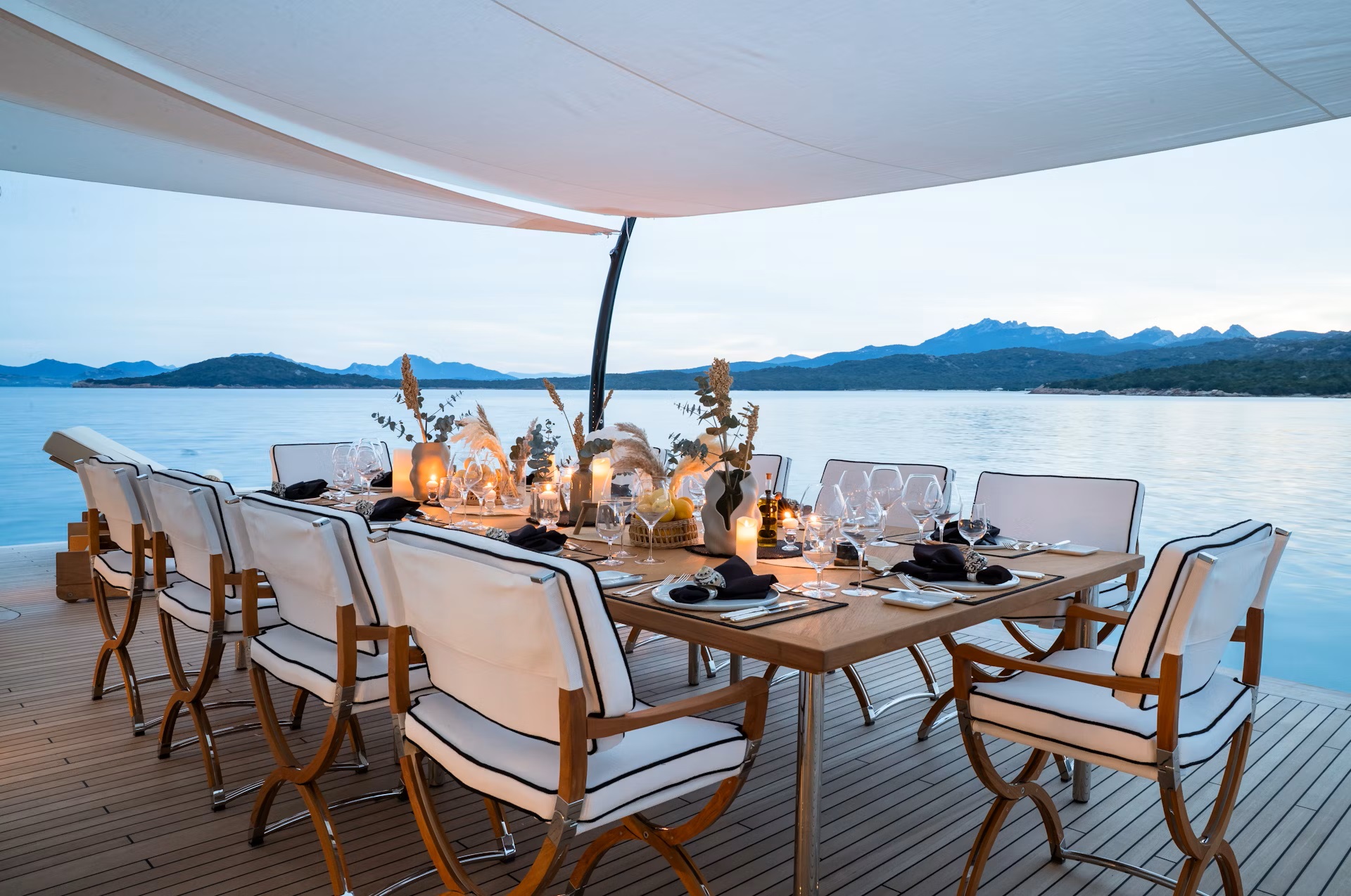 The main deck aft can cater for guests either in the day or evening and is configured with an aft dining setting with a long u-shaped sofa seat surrounding two tables and a lounge setting with stylish sofas and armchairs. The lounge is sheltered under the upper deck overhang while the dining setting can be kept in the sun or covered by a custom-made shade. The main deck leads down steps on either side to the large swim platform which can be set up with loungers and a table setting to create a water’s edge terrace. A large floating pontoon will extend the platform to form a sea pool and water toy dock.