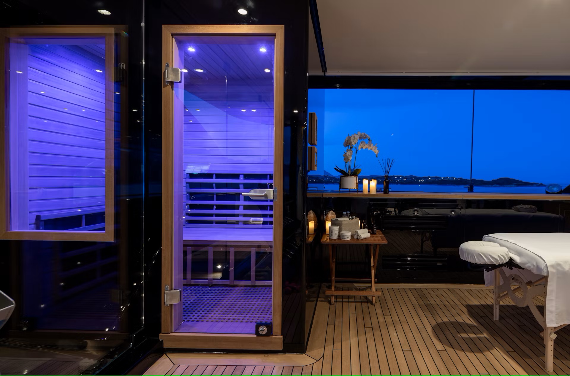 The sun deck also boasts a fabulous interior space with yet another sit-up bar and forward observation lounge with large windows offering sensational views over the bow. The top deck is a glass-enclosed wellness deck with gym, sauna and cold plunge pool plus treatment tables and amazing views.