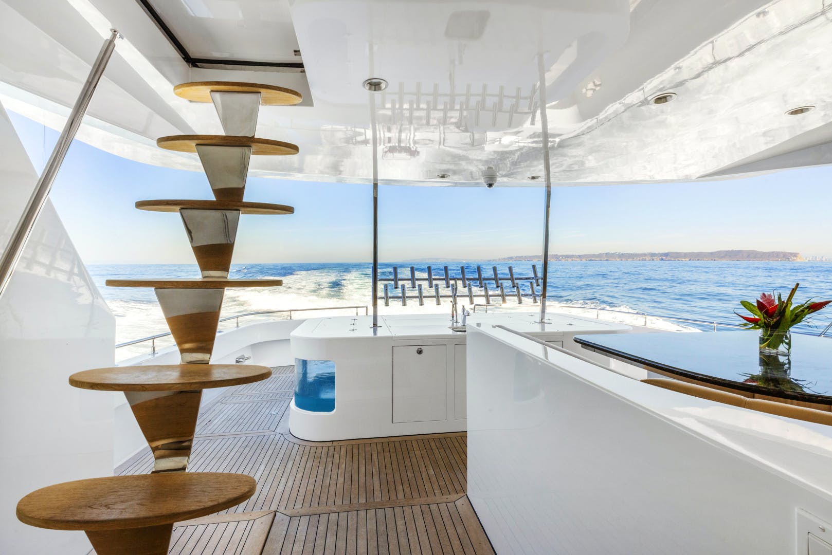 From the main deck, a staircase leads to the upper deck area, which provides space for tender or water toy storage. There are also two unobstructed side deck walkways, which lead to the bow of the yacht. Here there is a structural pulpit which extends 10 feet out, with a convenient recessed baitwell on the starboard side.