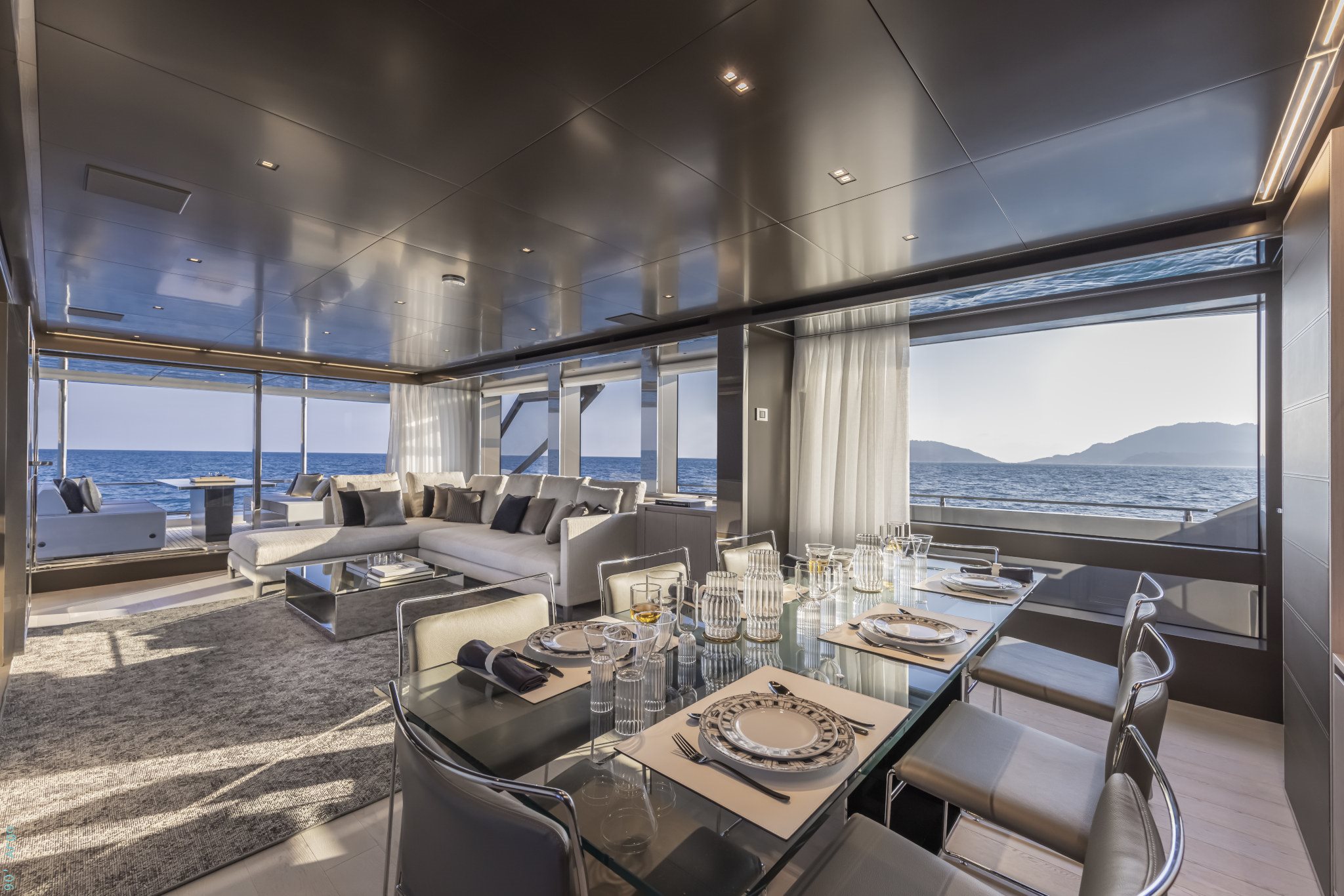 The main salon blends wood finishes with a contemporary neutral colour palette and choice of soft furnishings. A corner sofa and armchairs surround a low coffee table forming a lovely lounge space, while a formal dining table and chairs is forward. Substantial glazing ensures there is plenty of light and exceptional views from the salon. Guests can use the sliding glass doors to aft to access the exterior main deck.