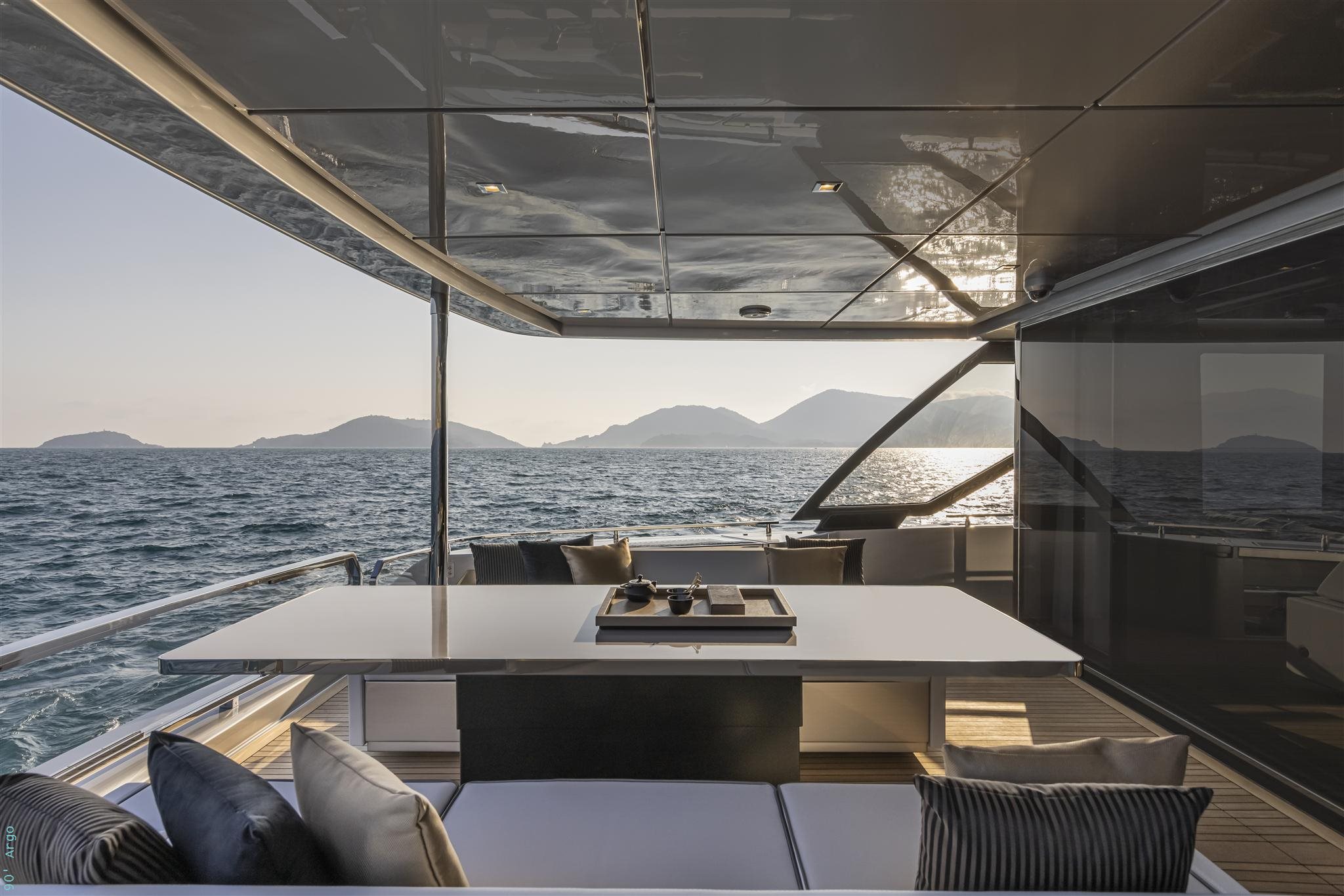 A silver hull and superstructure characterise this sensational Riva flybridge yacht with a spacious sun deck and both bow and aft terrace on the main deck.