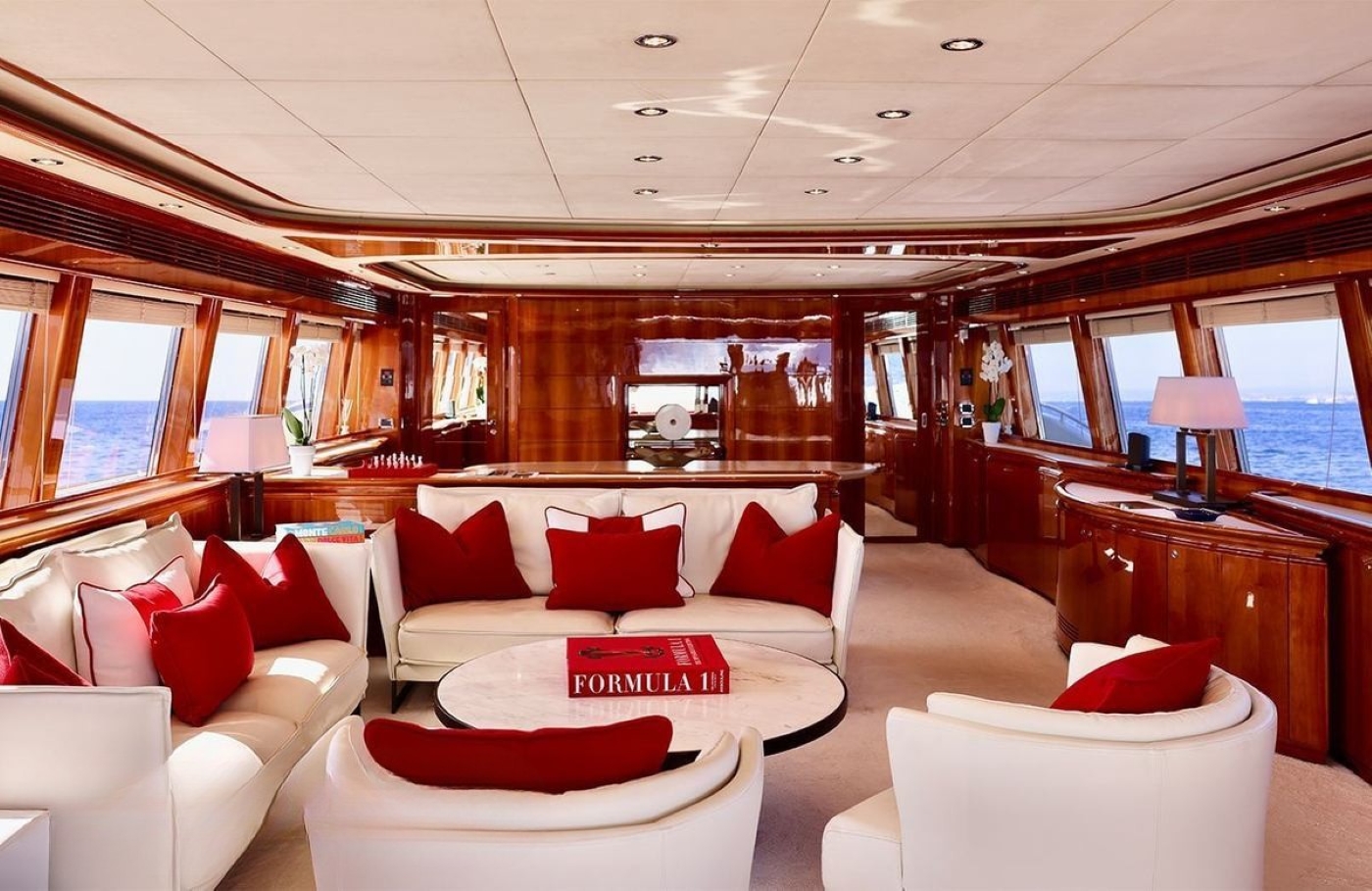 Her classic interior features lacquered wood in combination with white panelling and upholstery of soft tones. The main salon features panoramic windows, a large and inviting lounge and main dining setup.
