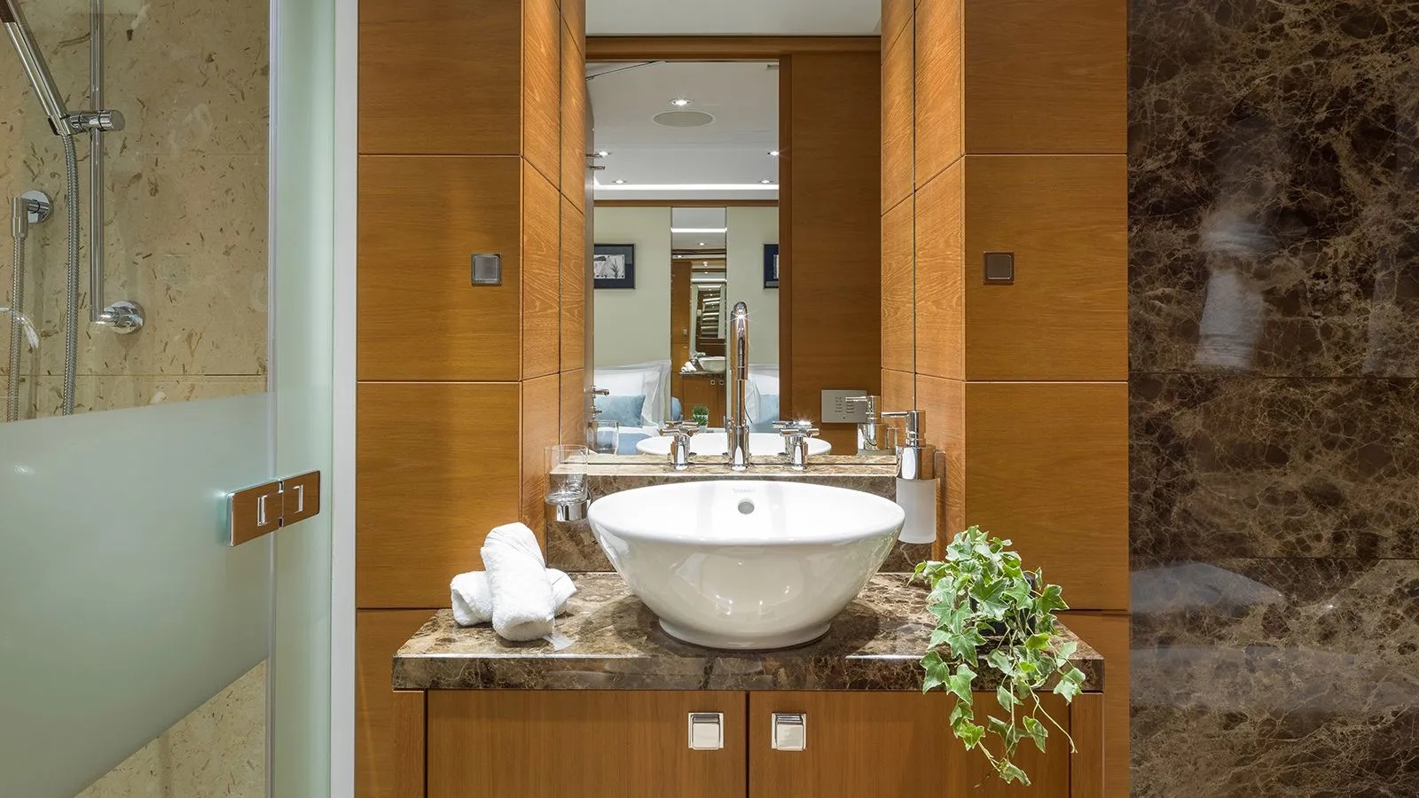 TALIA accommodates up to 12 guests across six well-appointed cabins: ~ Master suite: main deck, full-beam with king bed, ensuite bathroom, and private office ~ Upper deck cabin: queen bed, large windows and ensuite bathroom ~ 2 Double cabins: lower deck with ensuite facilities ~ 2 Twin cabins: lower deck, each with two single beds and ensuite bathrooms This thoughtful layout suits families and mixed groups alike, ensuring all guests enjoy space and privacy.