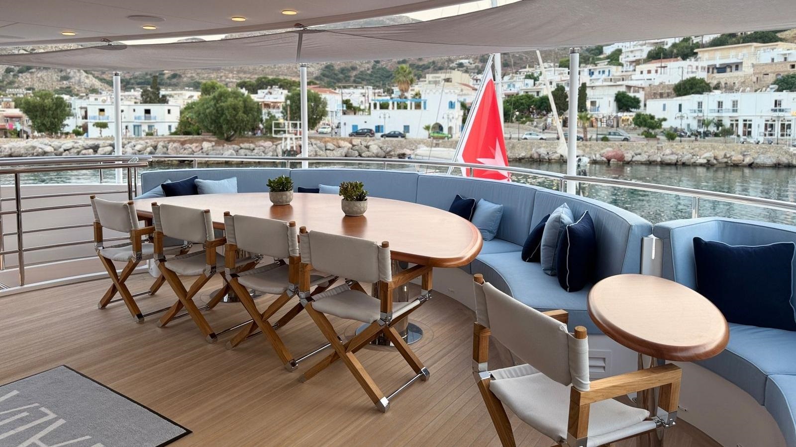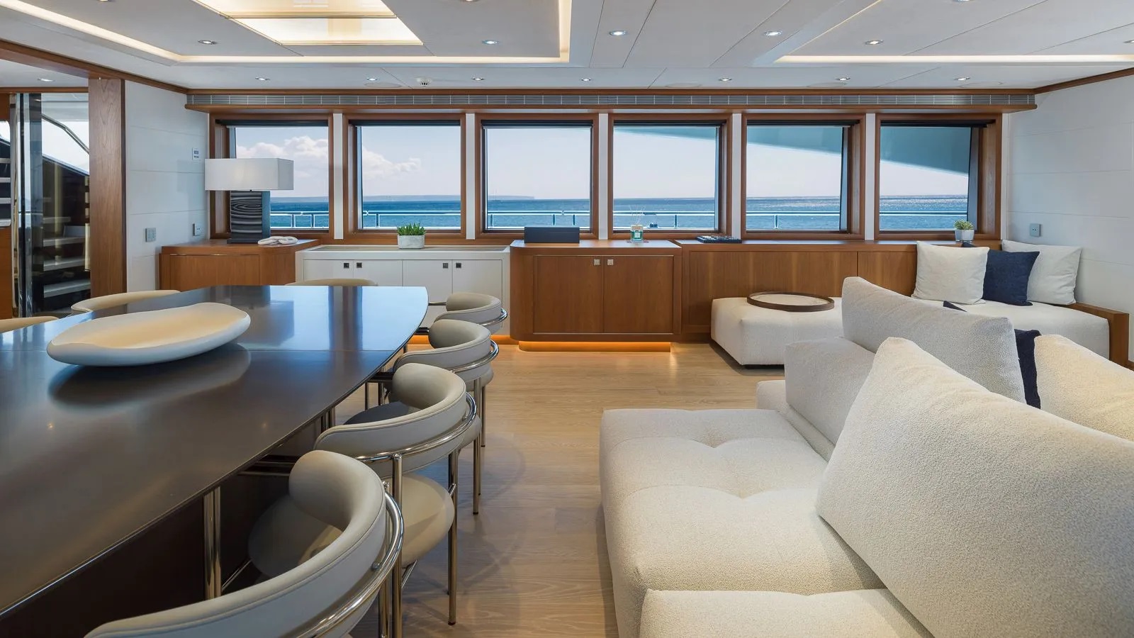Inside, the yacht has undergone a full 2025 refit, enhancing her contemporary elegance with light-toned materials and a fresh, welcoming ambience. The main salon is stylishly furnished, flowing into a formal dining area for celebratory meals or elegant evenings. Large windows throughout create a bright, airy feel, while the layout has been designed for both social gatherings and private moments. Her versatile indoor spaces ensure guest comfort in every setting.