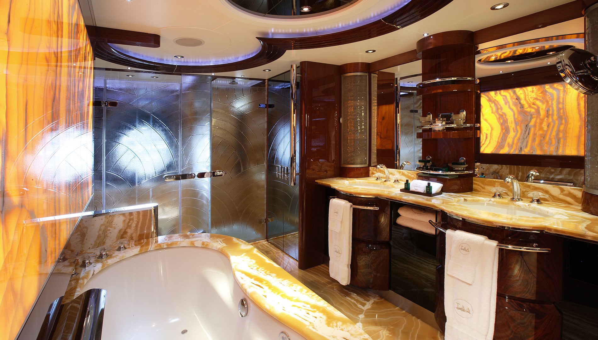 Luxury yacht TALISMAN MAITON offers luxurious accommodation for 12 in 6 stylish staterooms comprises 5 doubles and 1 twin. She has 4 guest staterooms, one twin and 3 doubles with queen sized berths. The VIP suite located on the main deck, port side. Queen size bed with storage under, bedside cabinets, sofa, tv and music in cabinet over, drawers and lockers under and a spa pool bathtub with sliding door. The Owner's Suite located forward on the main deck with oversized bed., nigh tables, easy chairs, low coffee table, TV, video and music cabinet, dresser, sofa, locker and dressing room ensuite with vanity and chair. Safe installed in concealed place. Entrance from Owner's lobby through Owner's office.