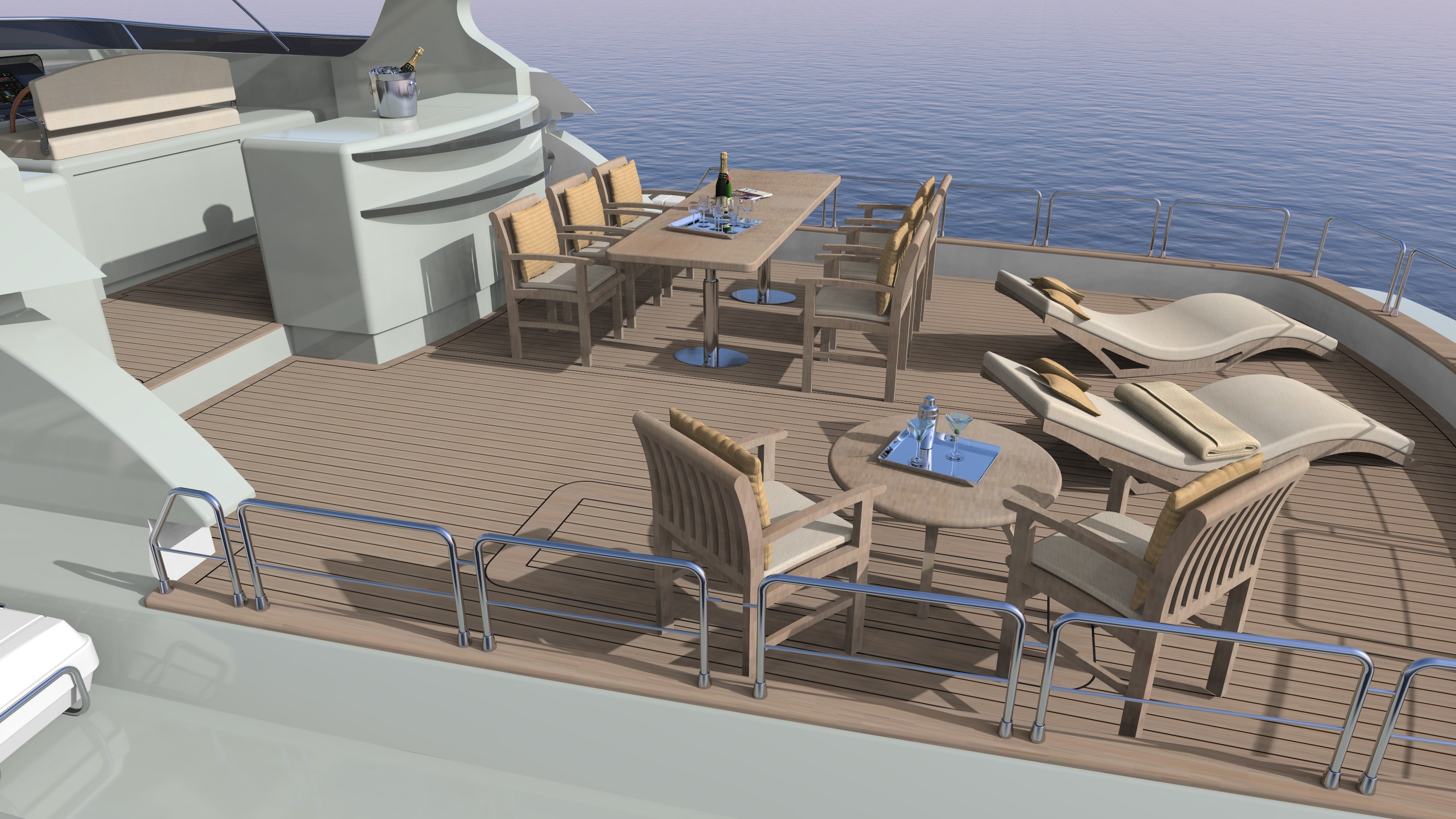 A port stairway from the main deck aft goes to the flybridge, which can also be reached through the raised pilothouse. Sun loungers, armchairs and drinks tables can be placed along the stern around the large alfresco dining table, and a canvas shade can be extended over diners for comfort. The forward flybridge is raised and covered, and hosts a bar, barbeque grill and a starboard sunbed beside the helm controls.