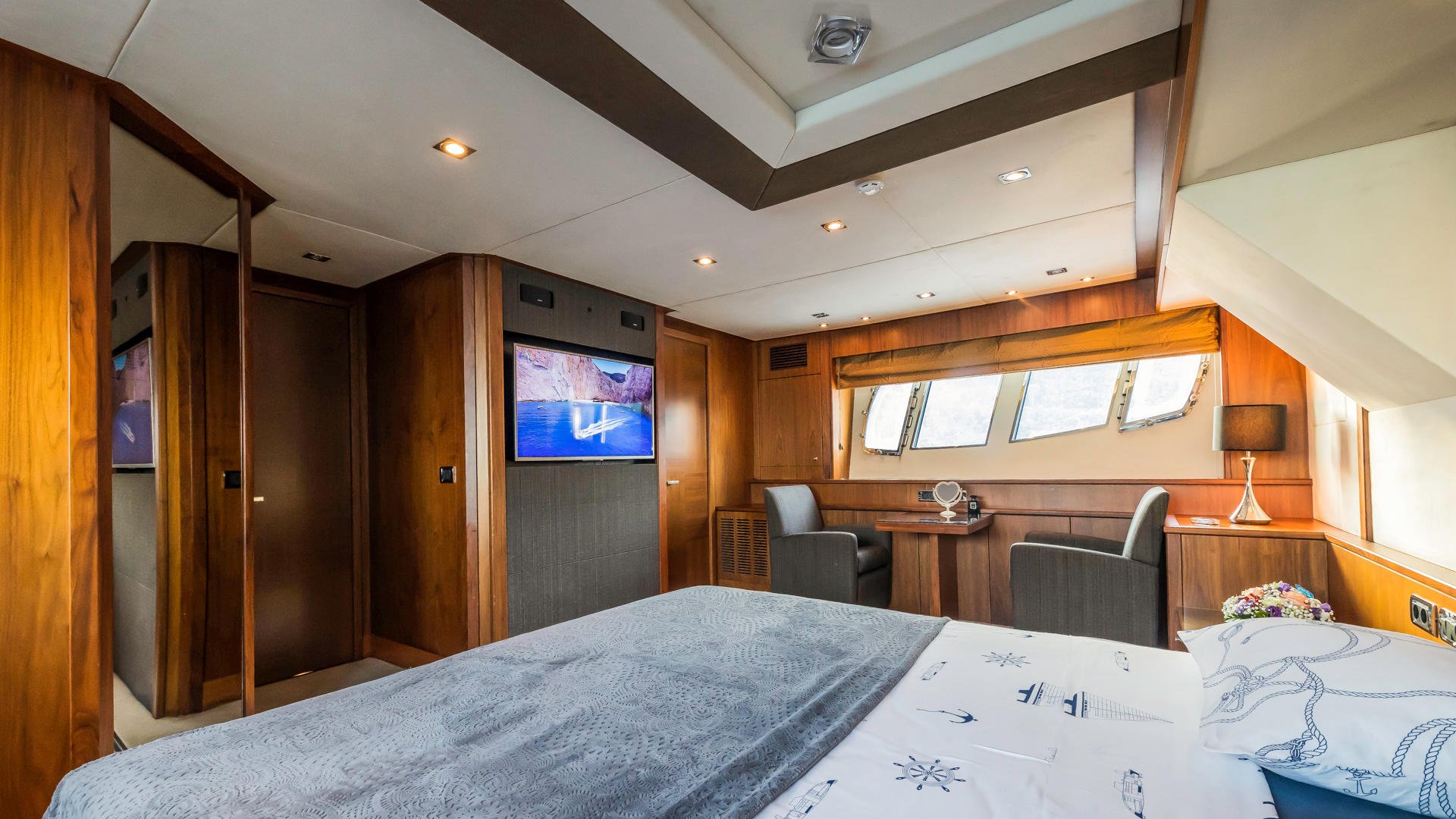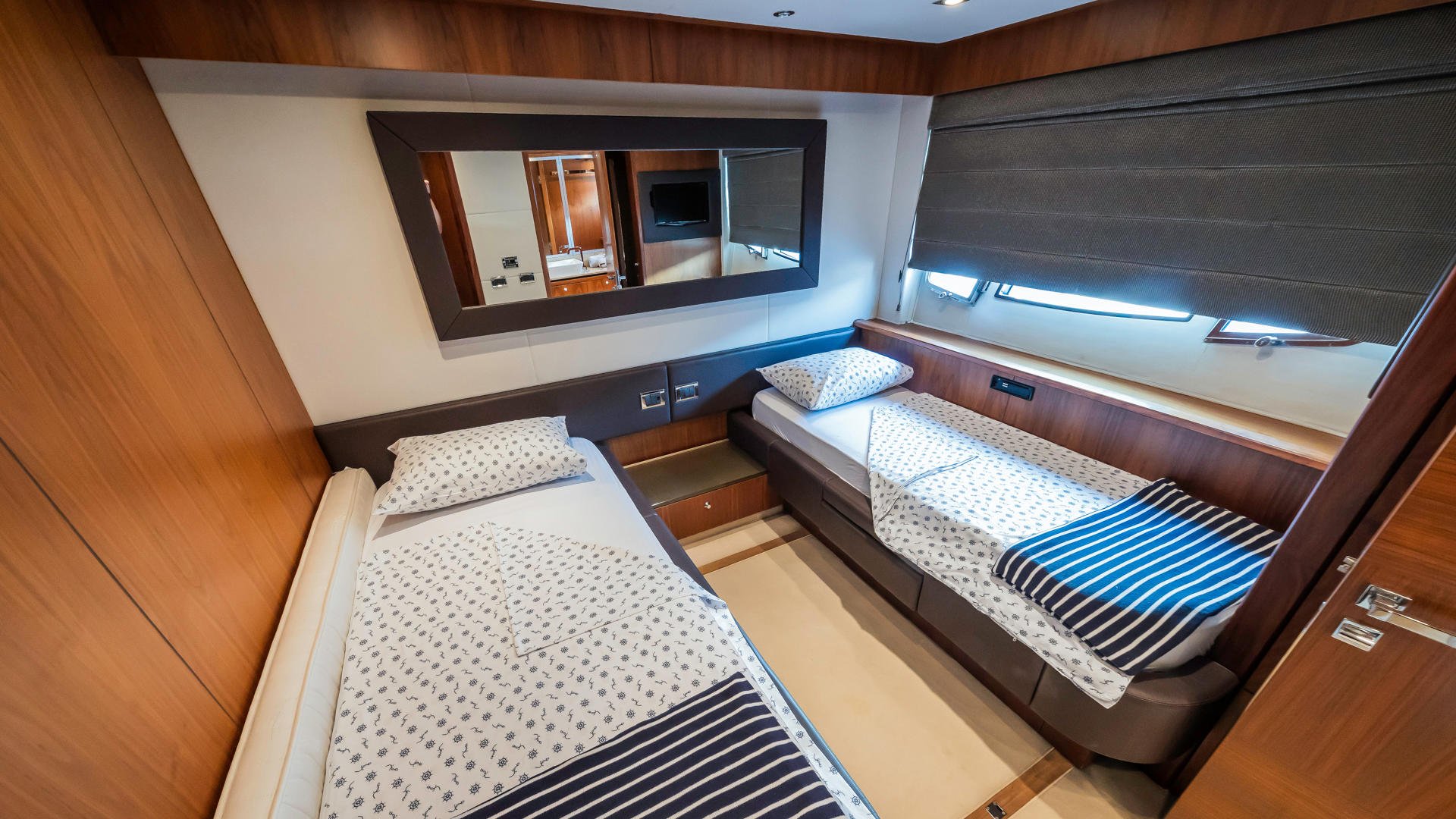 Sunseeker 86 motor yacht THE BEST WAY offers accommodation in 4 cabins for up to 8 guests, each with private en-suite facilities. Amidships and forward is the full beam master cabin, with double bed, table and seating area and large en-suite. Forward and full beam of the yacht is the VIP cabin, offering a center lined double bed. Aft and amidships are 2 mirror image twin cabins, with side by side single beds. Both twin cabins convert into double cabins, offering a versatile yacht layout, in addition, one twin cabin boasts a Pullman berth for a 9th guest. M/Y THE BEST WAY is fully air conditioned for optimum relaxation.