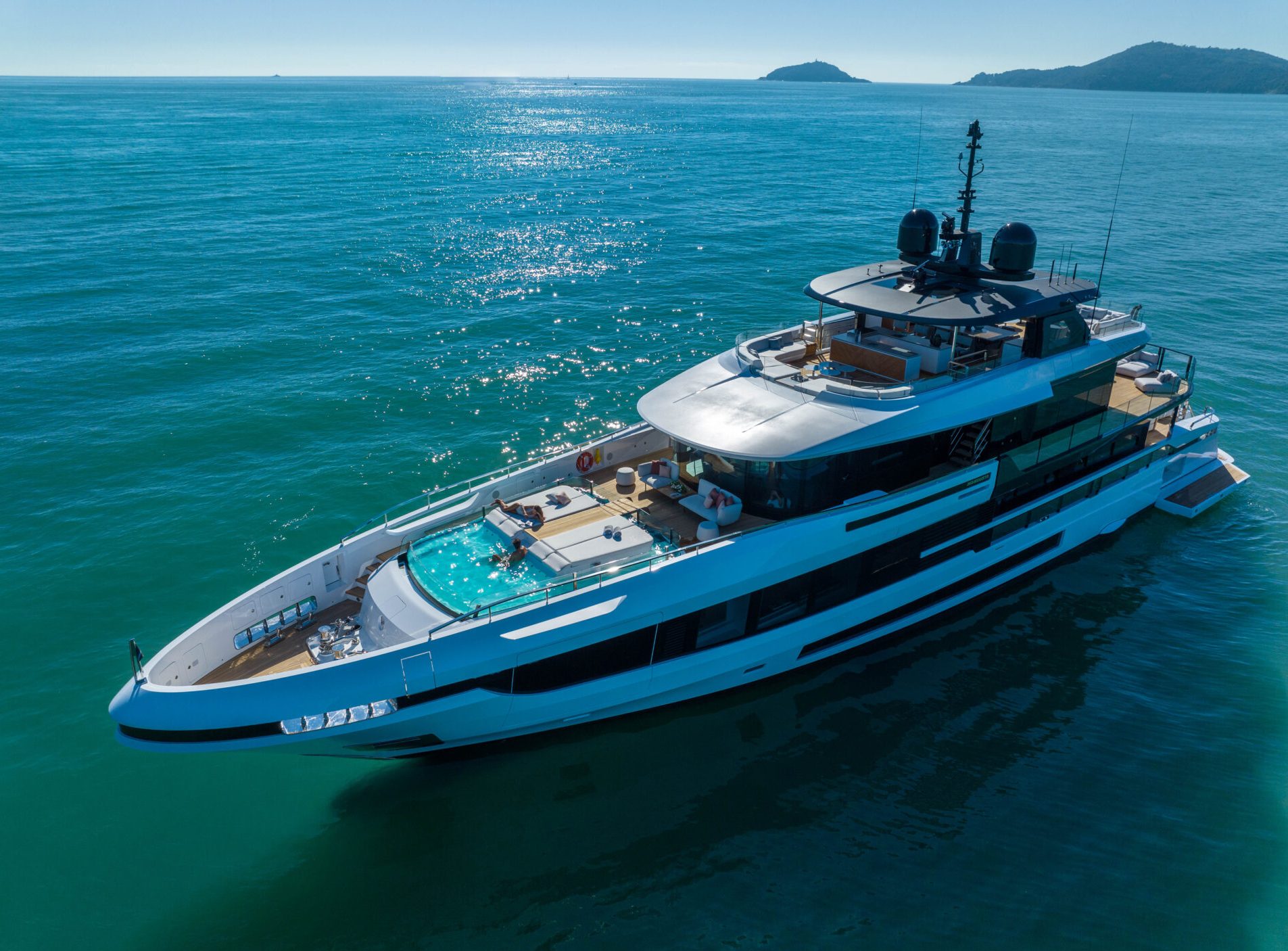 Her exterior offers a 104sqm sundeck and sociable beach area with fold out transom and side terraces which deliver 180 degree views.