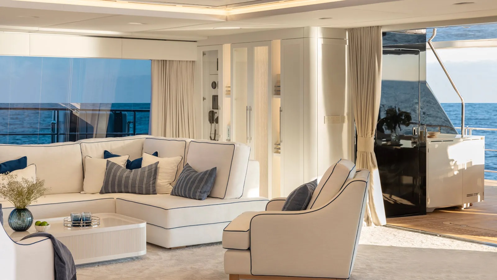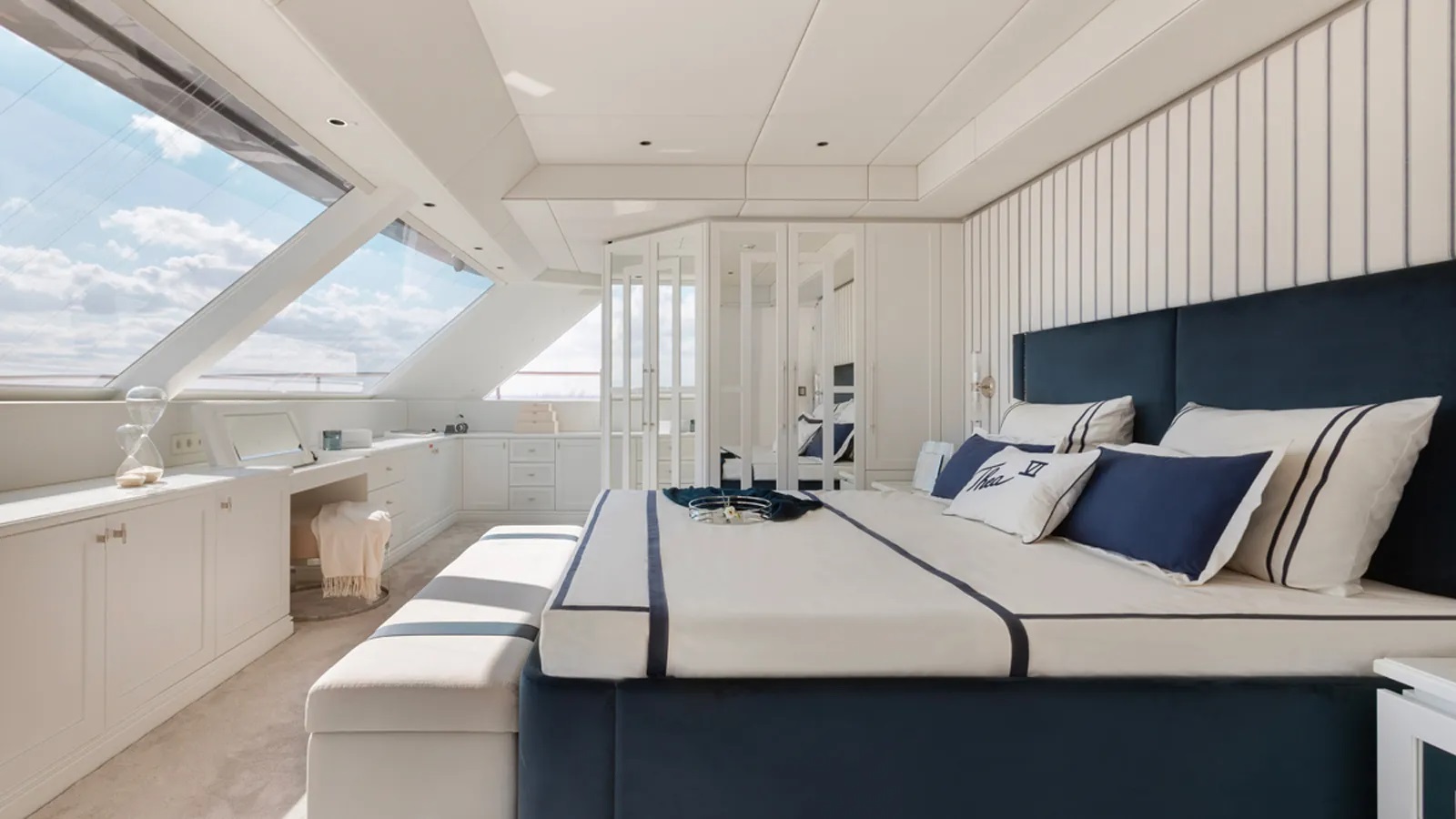 The nautical colour scheme creates a fresh and welcoming atmosphere throughout the yacht.