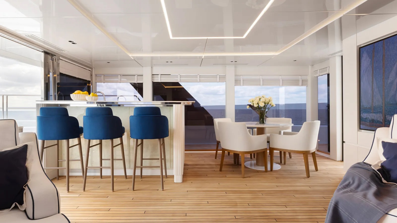 The stern cockpit features a hydraulic aft platform and a garage for two large jet skis, a refueling station, and a selection of water toys. The platform can be levelled with the aft skirts to create a large beach club.