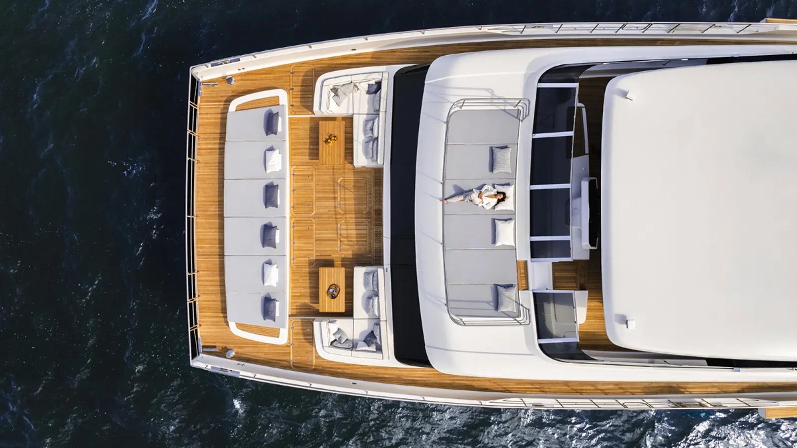 Designed for all-year round navigation in supreme luxury, the yacht boasts wide beams which offer generous al fresco entertainment and relaxation space. Individually customised for this model the spaces are unique and inviting offering sheltered seating and plenty of sunbathing areas.