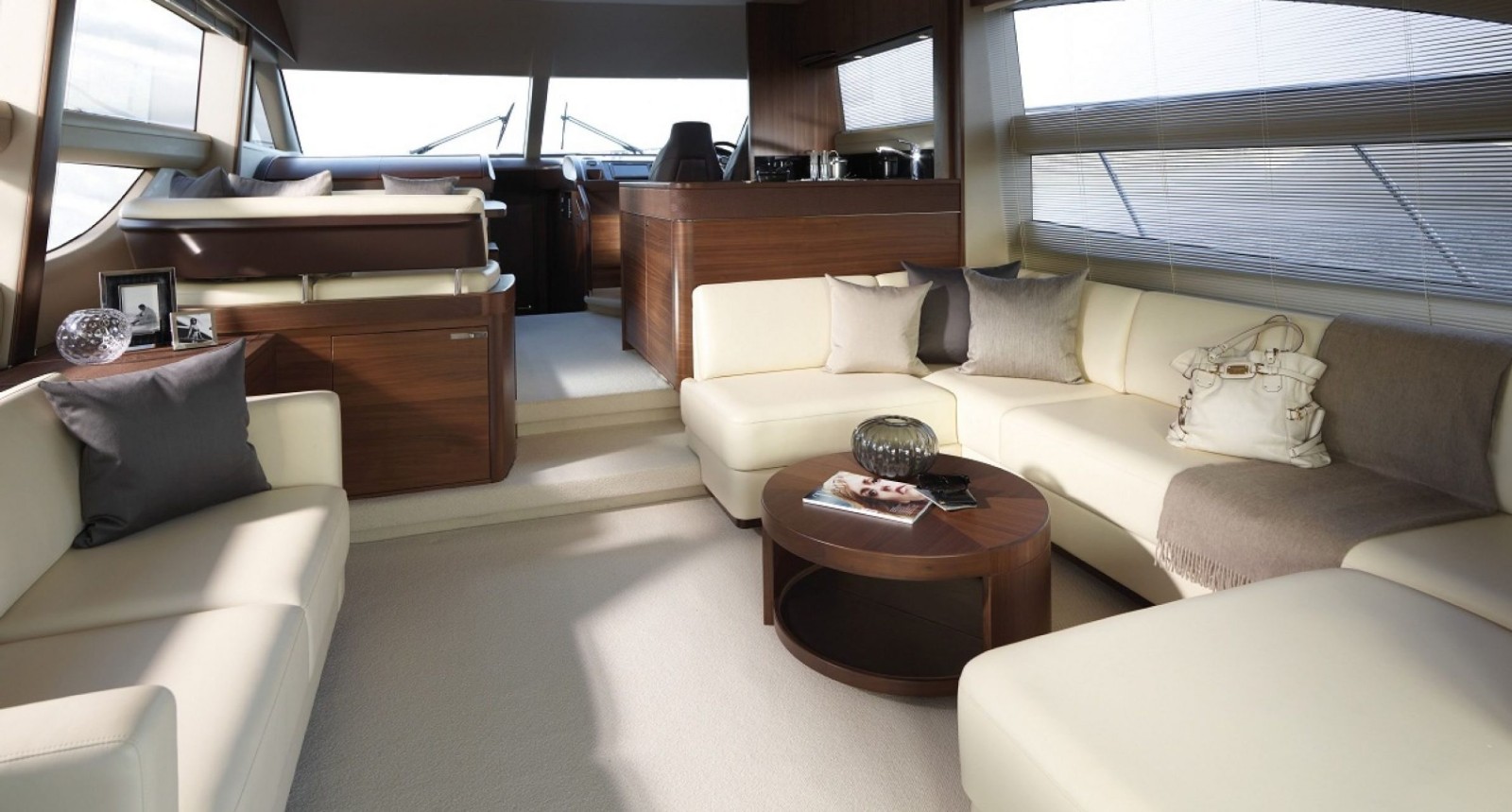 The main salon can be opened up with a sliding roof, side windows and rear doors to create one impressive space combined with the aft deck. The space presents a neutral décor and offers plenty of plush sofas and chairs for all guests. The main helm station is forward in the main salon.