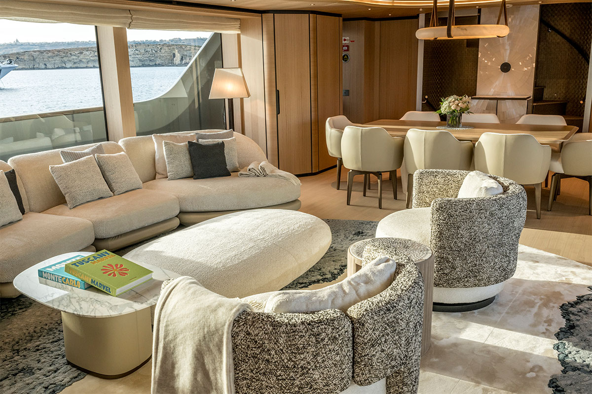 The main salon is filled with light thanks to the floor-to-ceiling windows and is filled with an arrangement of stylish furniture. There is a lounge aft and a dining setting forward, plenty of lovely soft furnishings a cool lighting. Amidships on the main deck is the central foyer giving access to the well-equipped galley and pantry, day head and forward master suite.