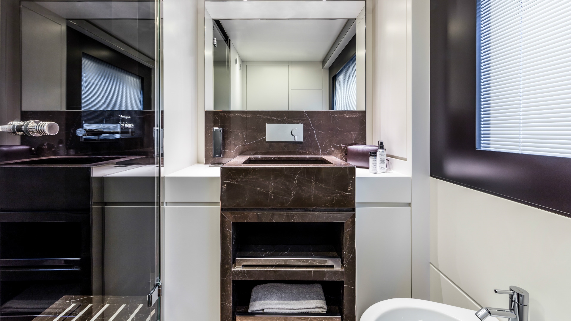 The accommodation sleeps a maximum of 10 guests over 5 en-suite cabins: 1 Master suite, 2 double cabins and 2 twin cabins, one of which is convertible to a double. ~ The Master suite on the main deck is furnished with a king-sized bed, bedside tables with reading lights, a walk-in closet and a vanity/office with a leather chair. The en-suite facilities have two sinks, mirror, a shower with a bench and a separate room for the toilet and bidet. ~ The two double cabins come with a double bed, TV and en-suite bathroom with a sink, mirror, shower, bidet and toilet. ~ The twin cabin and twin cabin convertible to a double each have a TV and en-suite facilities equipped with a single sink, mirror, shower, toilet and bidet. ~ The crew of 5 will ensure that all guests on board have a fantastic time throughout their cruise.