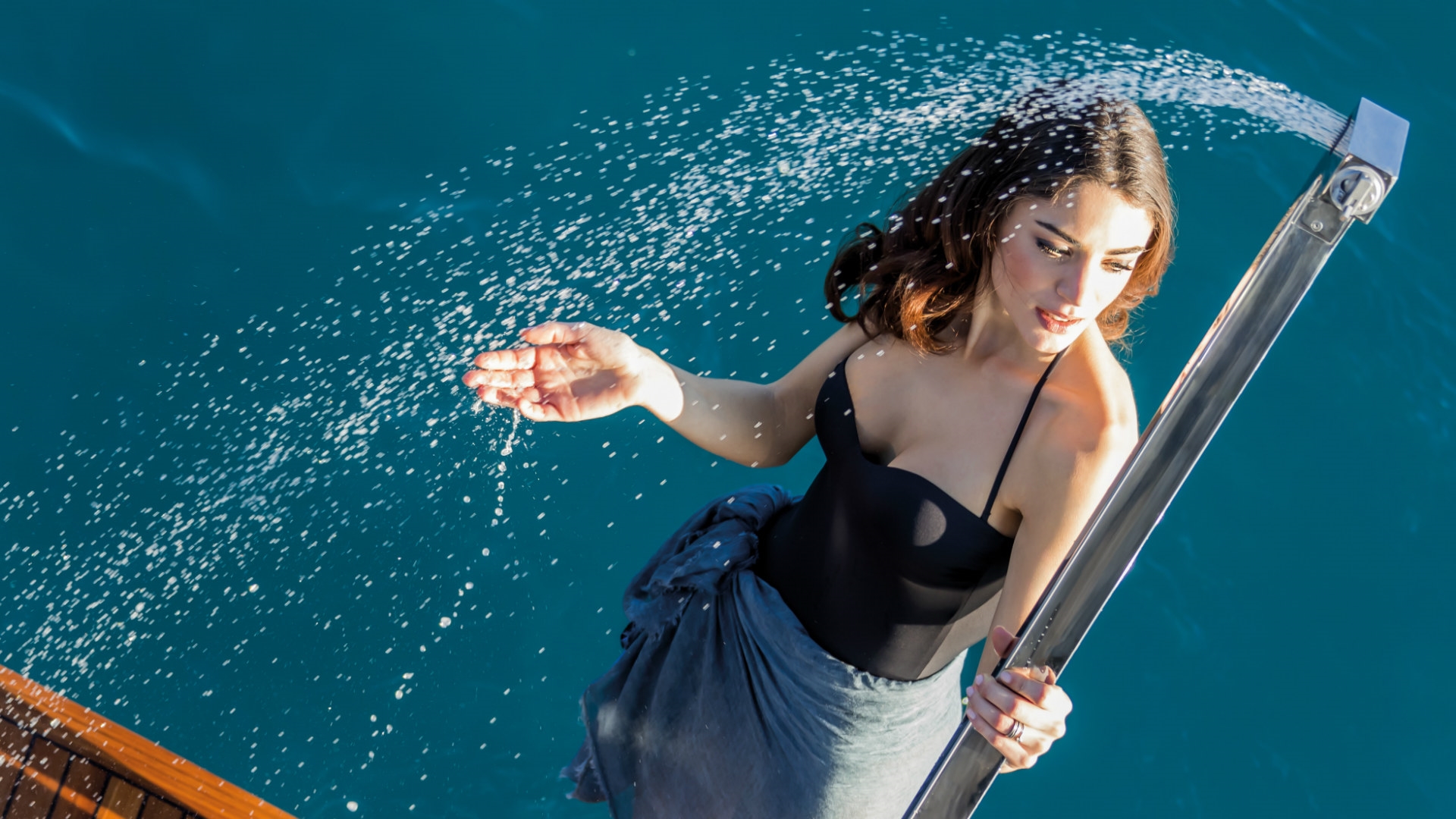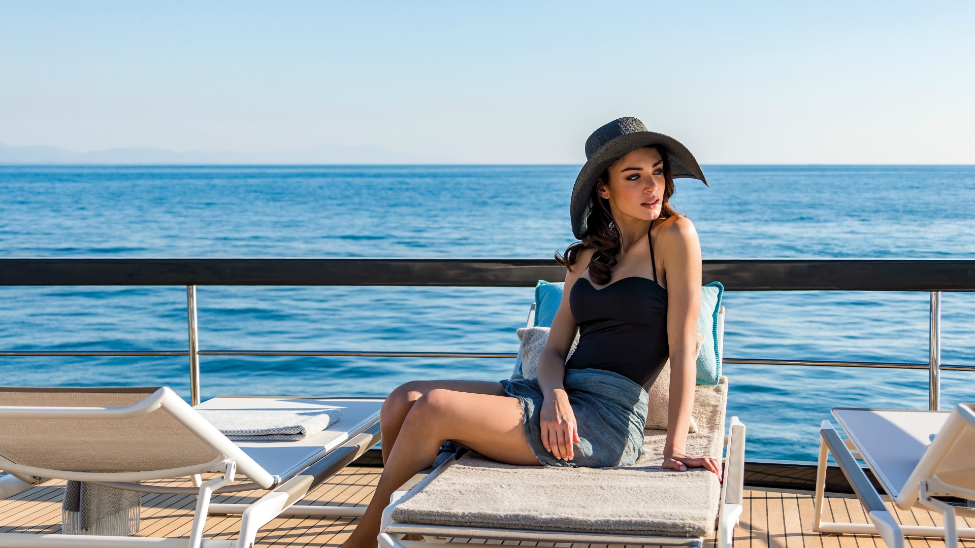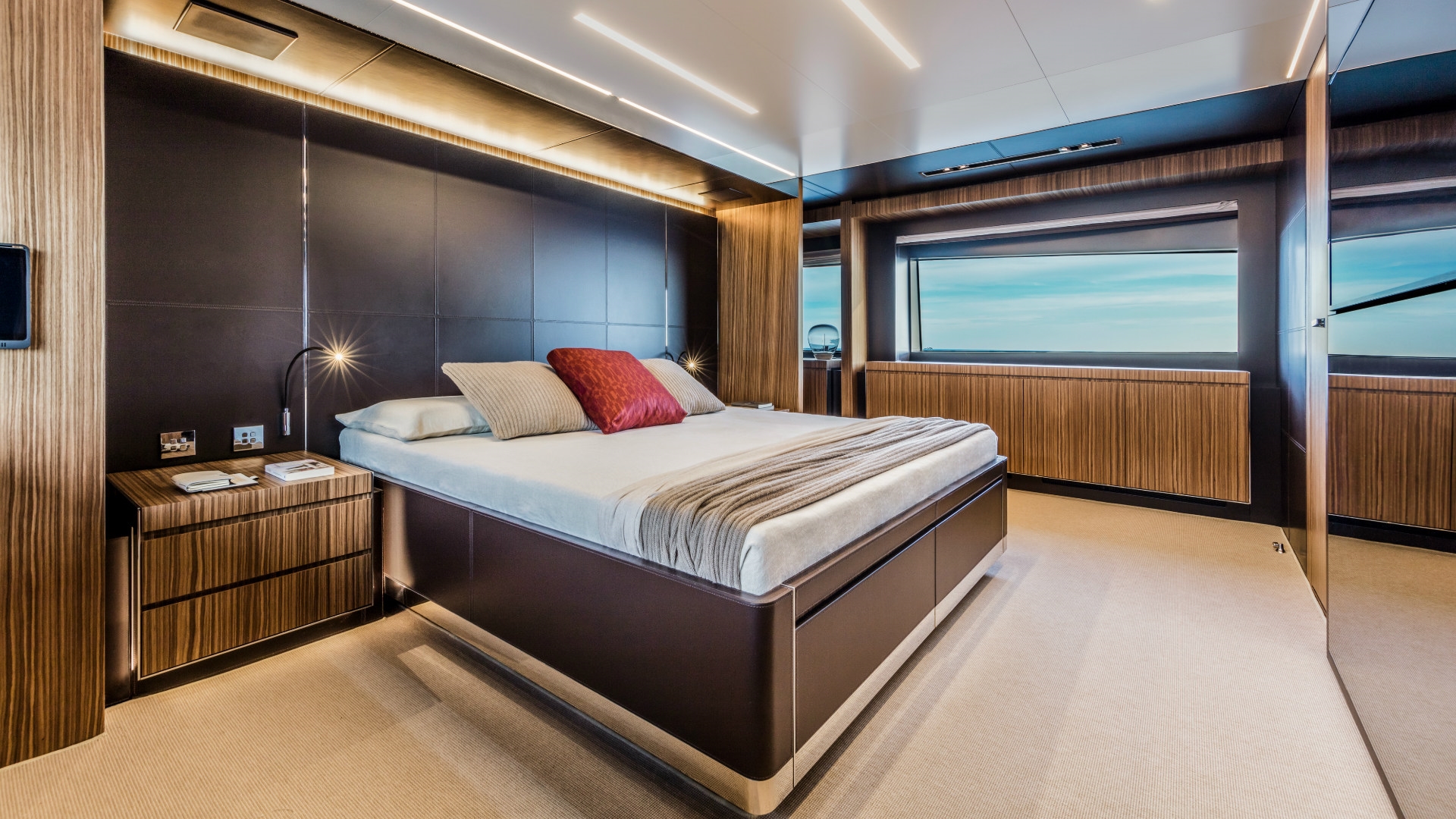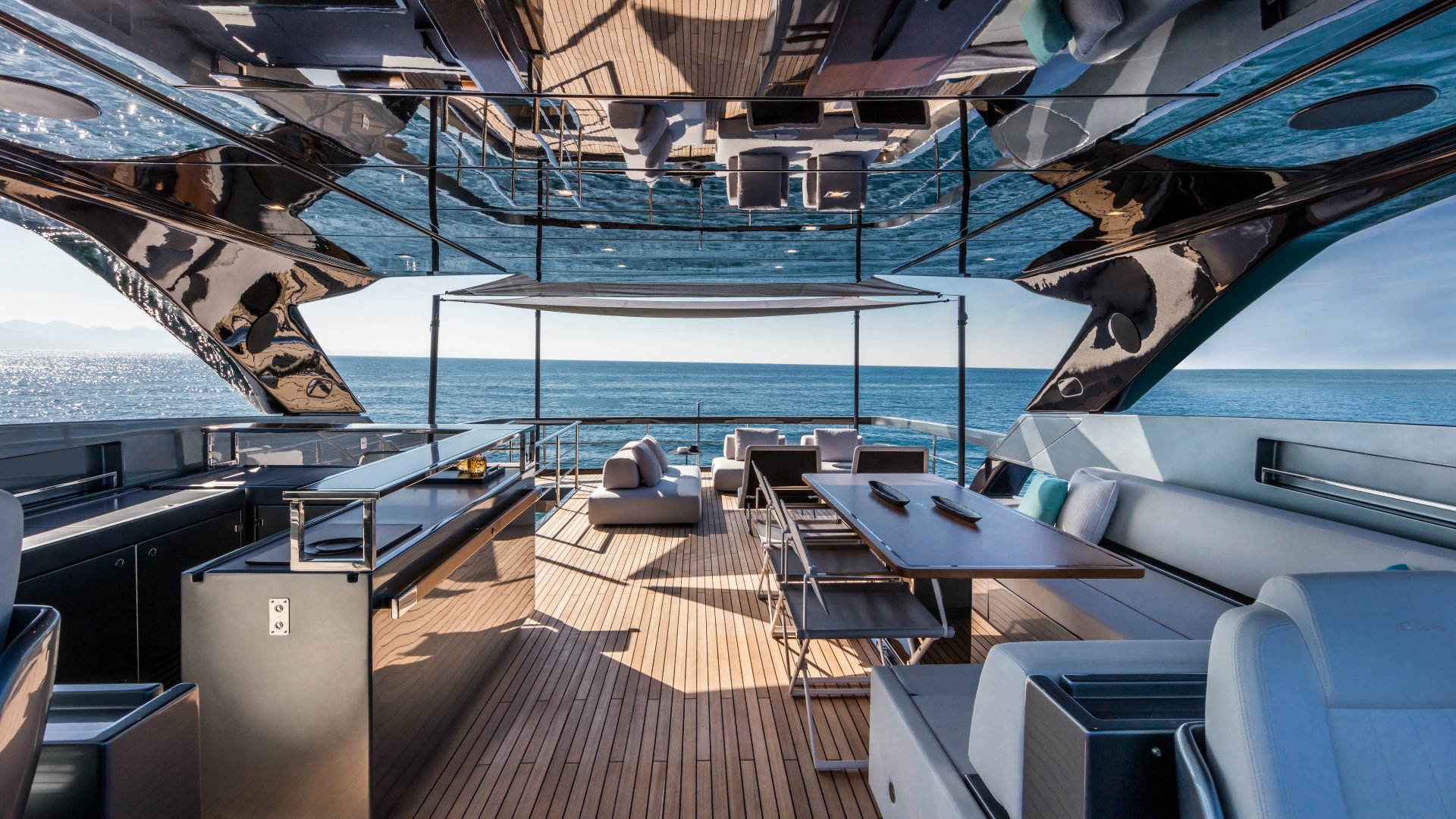 From the lower deck swim platform guests can access the main deck aft via a stairway, where there is a plush sofa and raised table for alfresco dining or resting outdoors with reading material. The formal dining area can be found to port, while the foredeck is furnished with a broad sunbed and a C-shaped sofa for conversations together while enjoying panoramic views.