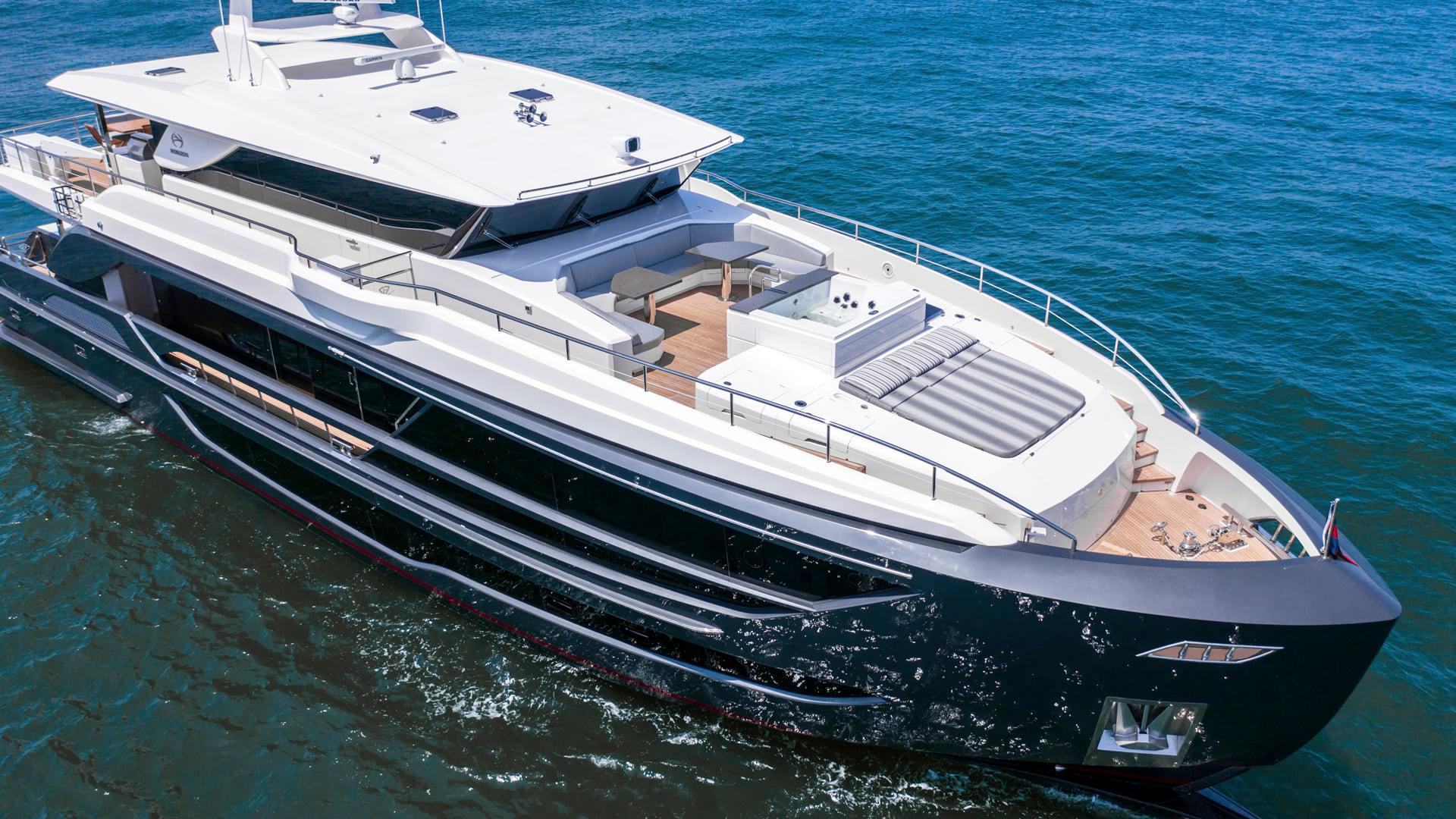 The flybridge aft is used for storing the tender, which can be safely launched and retrieved using a Davit crane. The alfresco dining area is just outside of the salon, and the port-side walkway will take guests to the foredeck for uninterrupted views while enjoying a cocktail in the sofa, soaking in the Jacuzzi or sunbathing on the large row of sunbeds near the bow.