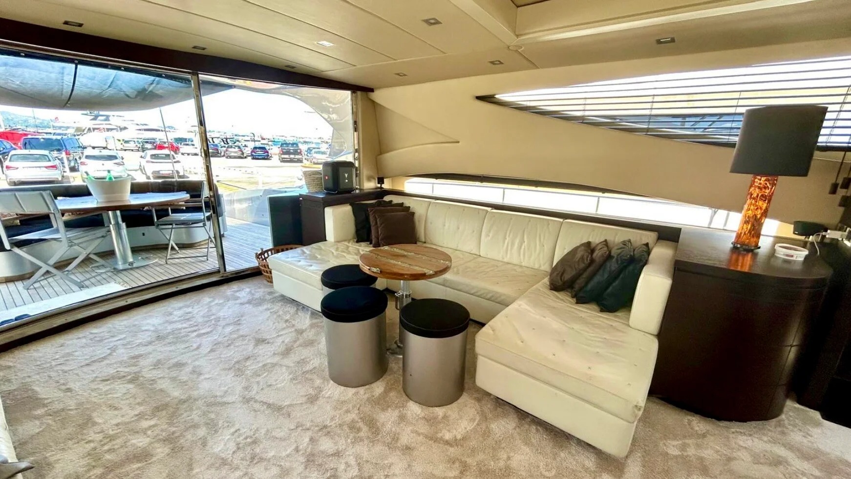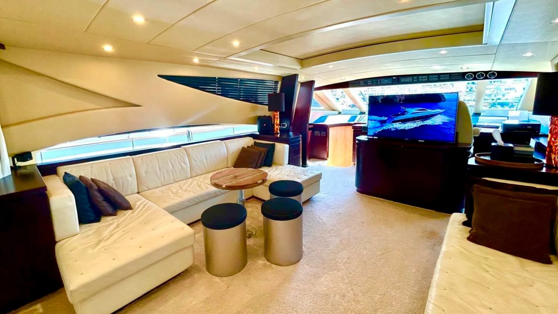 The interior is elegantly appointed yet informal, with large windows bringing in sea views and natural light. A spacious salon accommodates relaxed seating and dining beyond, flowing toward the helm in a gesture of sociable openness. Soft tones, polished woods and refined furnishings create a welcoming environment with understated Mediterranean charm.