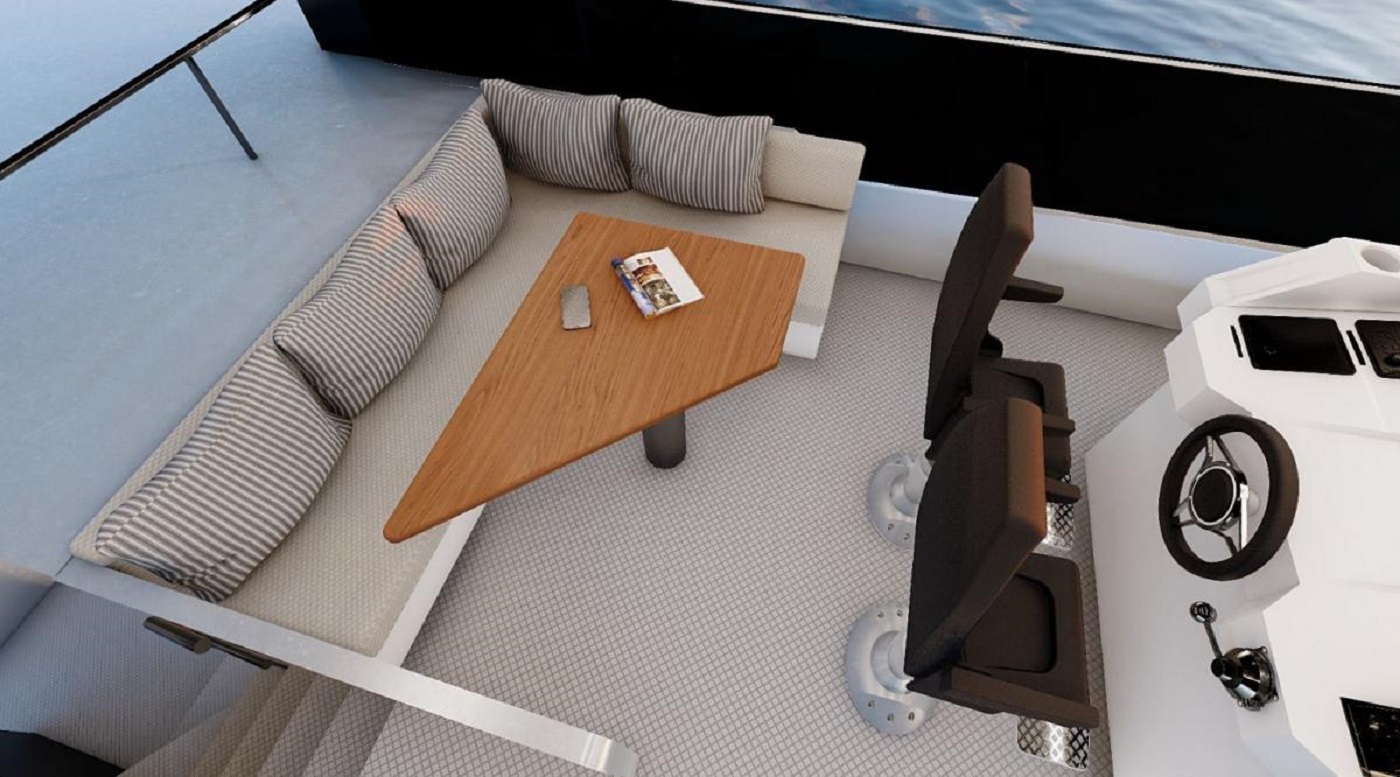 The main deck presents a modern salon design, featuring two L-shaped sofas around a coffee table to create an inviting and cosy space.