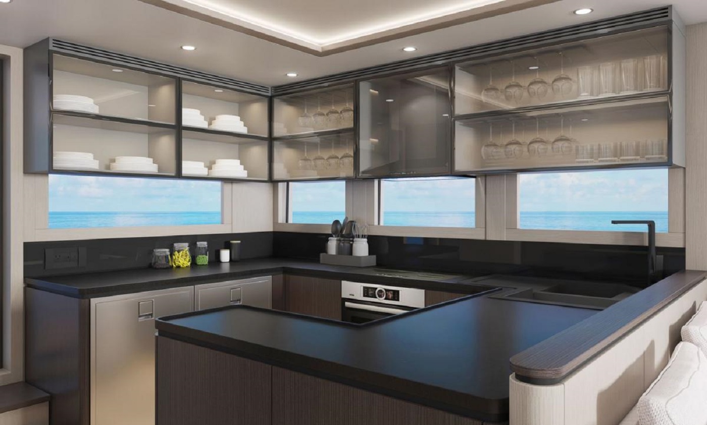She can sleep up to six guests across three staterooms, with her master stateroom featuring a comfortable seating area, raised bed and a skylight, perfect for star gazing in comfort.
