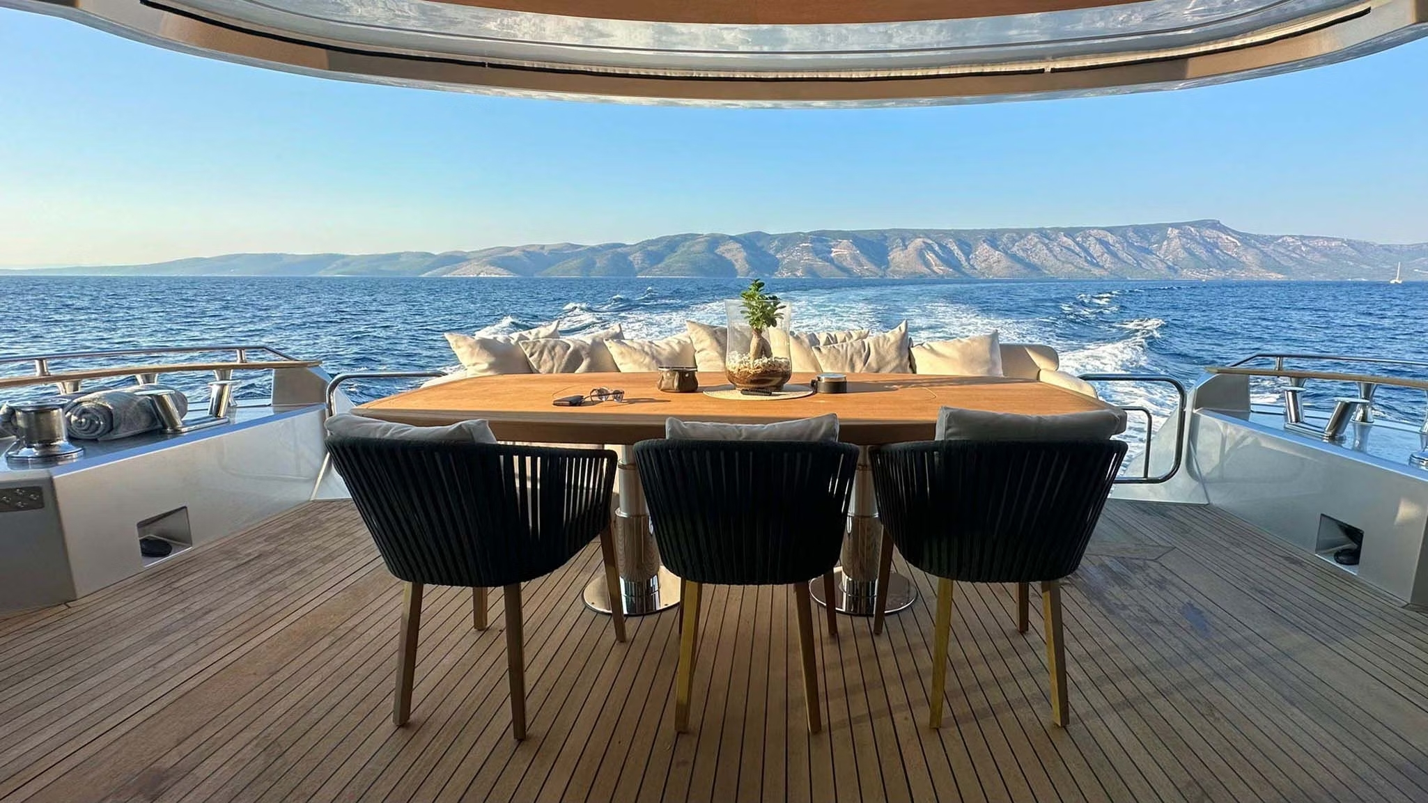 VENUS features a contemporary flybridge design with generous outdoor living spaces across multiple levels. The main deck aft platform provides easy access to the water and serves as the primary entertainment area. The flybridge offers elevated views and additional relaxation space with integrated seating areas. Her semi-displacement GRP hull delivers impressive performance with a cruising speed of 12 knots and maximum speed of 23 knots, powered by twin MAN 1400 KW engines.