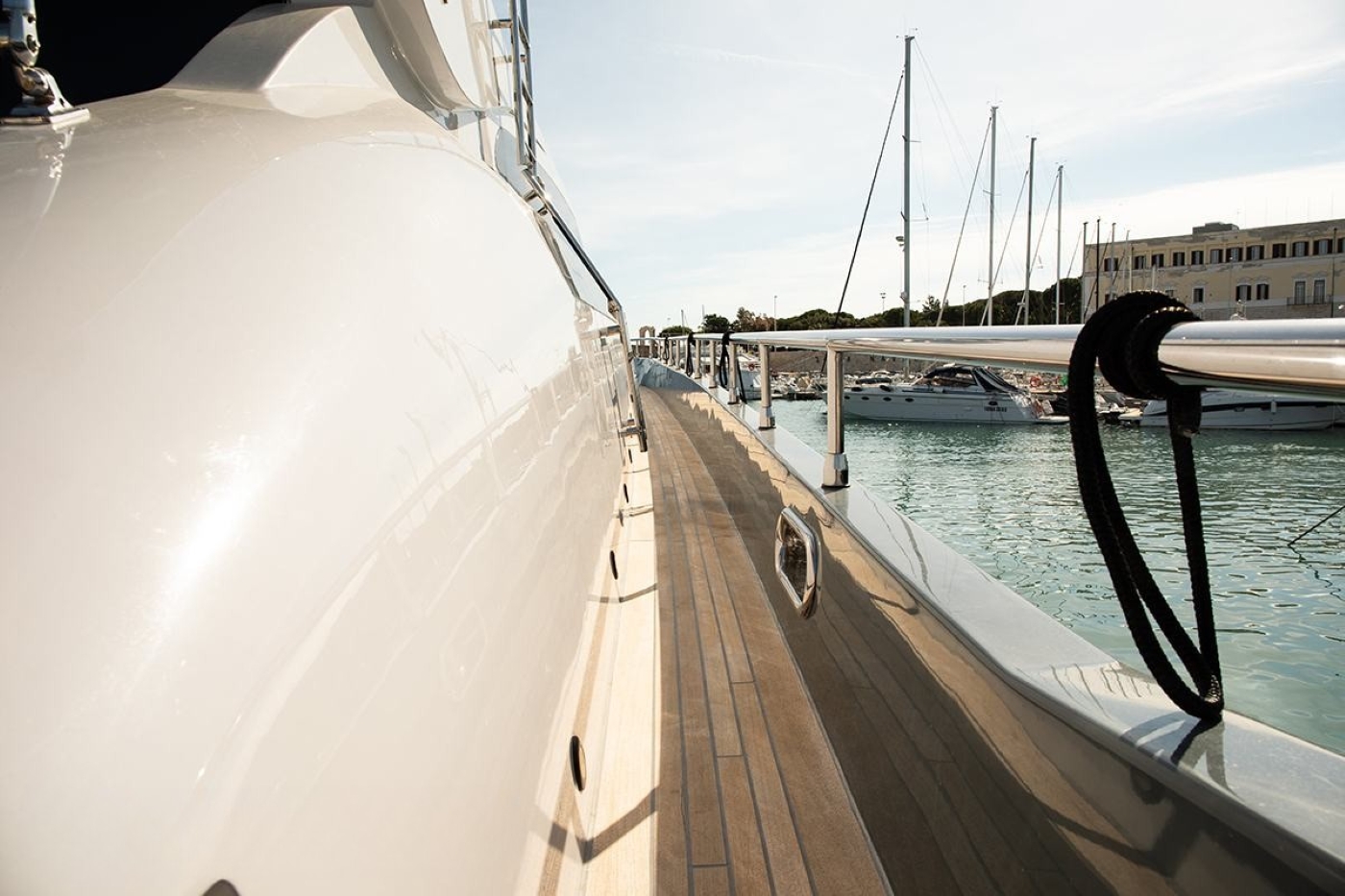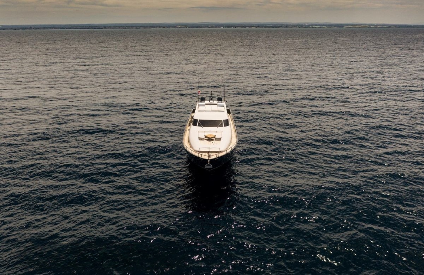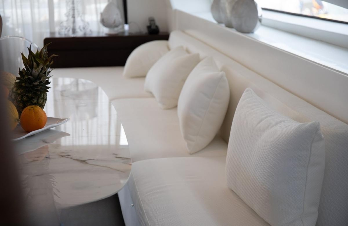The lower deck swim platform provides a large area for sunbathing beside the water, and two stairways connect up to the main deck aft where guests can lounge and dine in the sunshine. Side walkways lead around to the foredeck, where a sunbed provides a comfortable place to rest and take in the local scenery.
