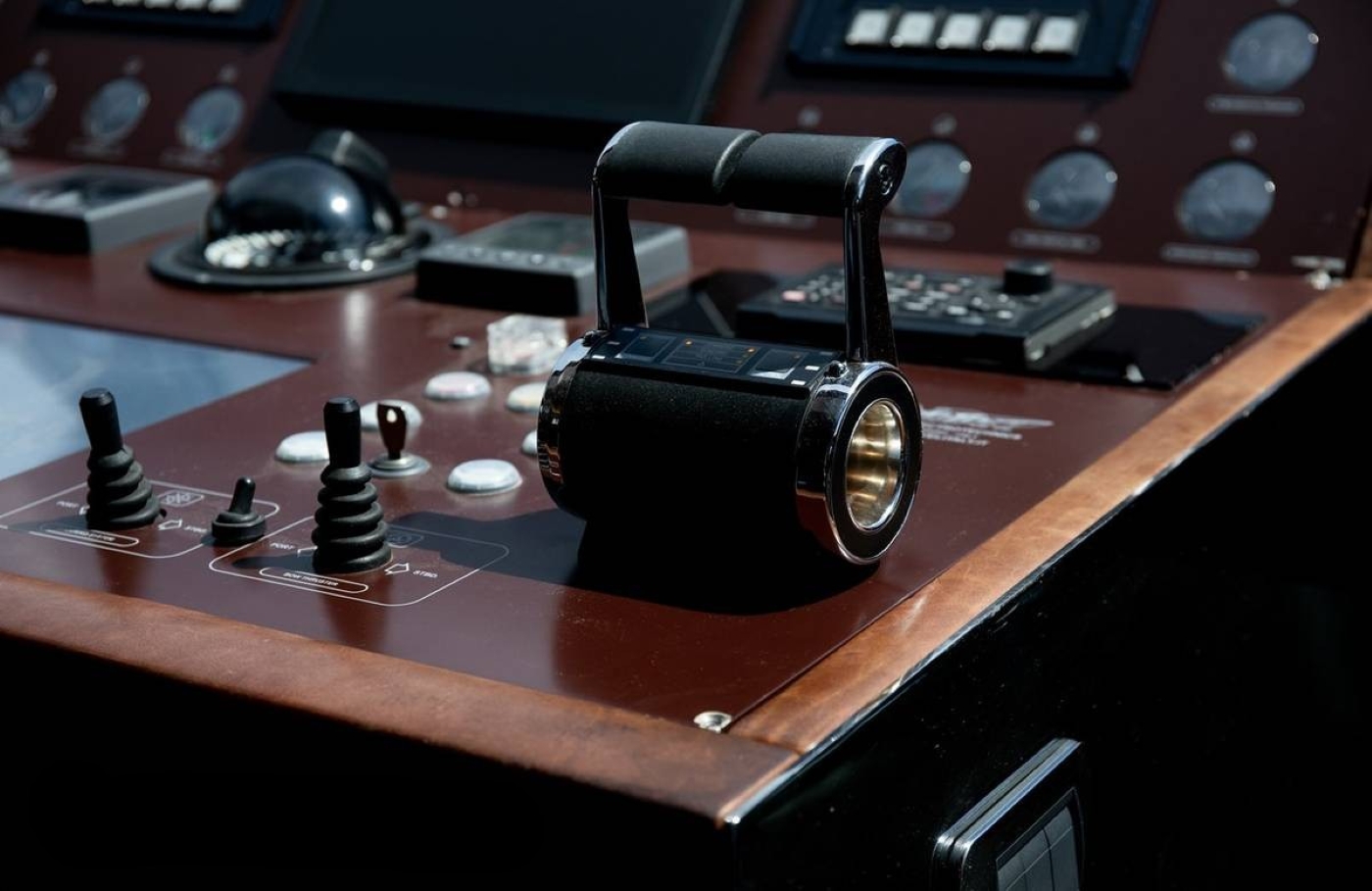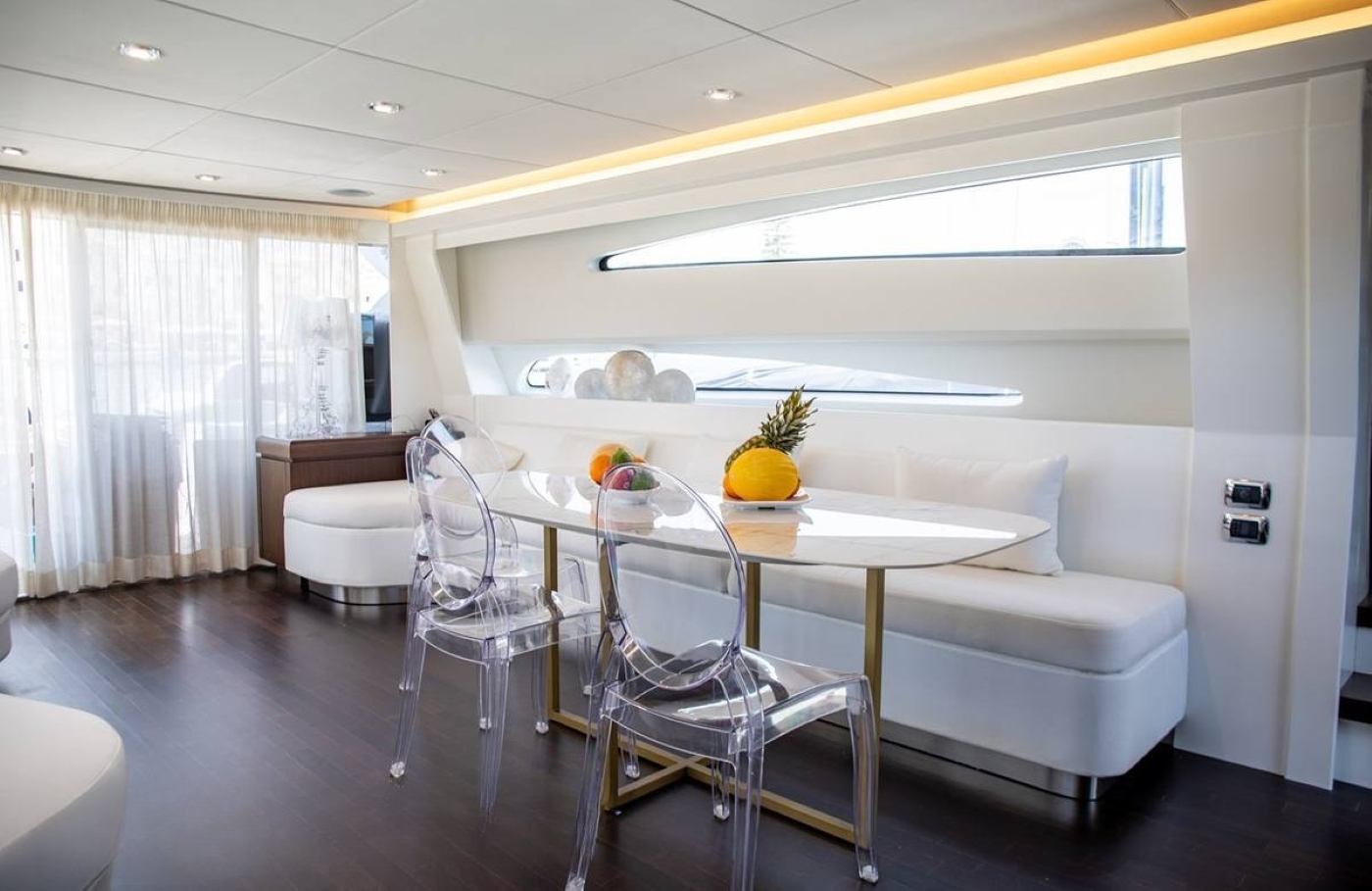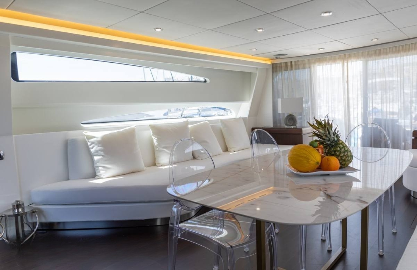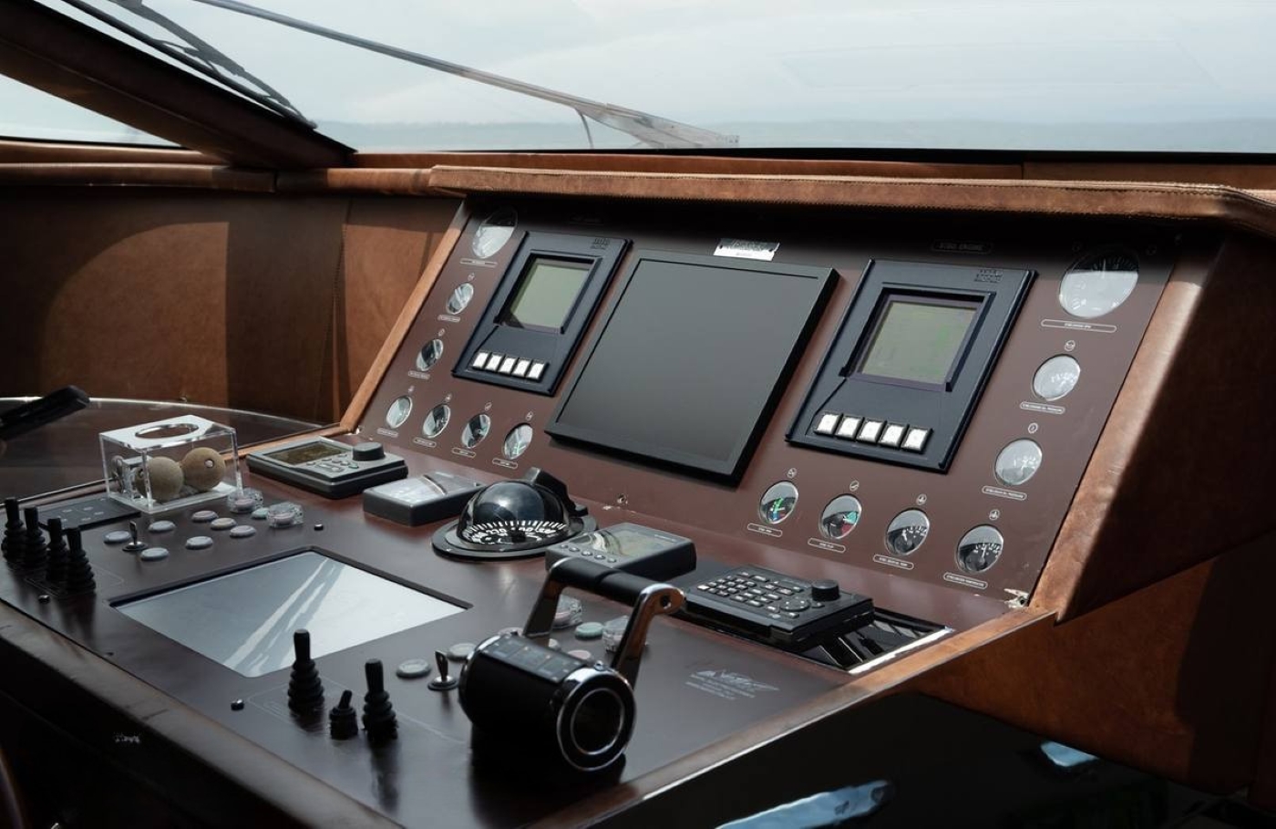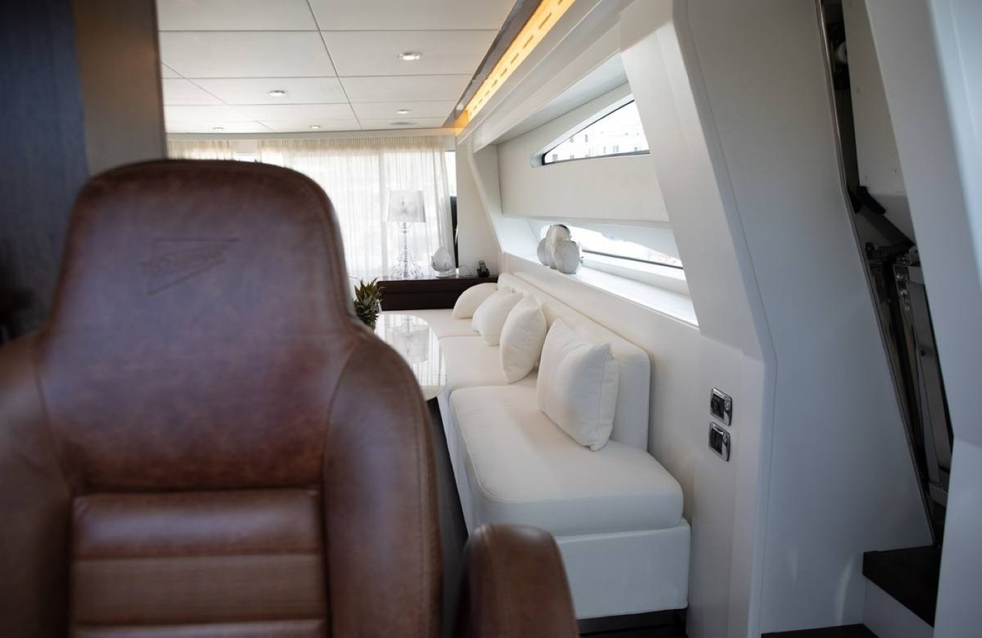 A set of stairs leads up to the main deck, where the helm controls are forward and immediately behind a central wall panel separates the pilothouse from the salon. A widescreen TV is mounted on the wall and an armchair placed beneath, while the port and starboard walls both have a sofa running along and a coffee table at the centre of the room.