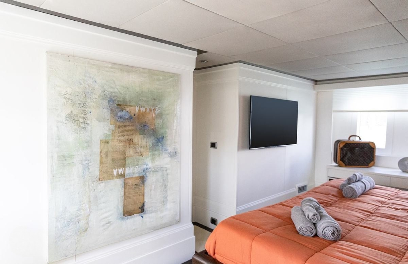 While up to 12 guests can remain on board while cruising, the accommodation sleeps a maximum of 6 guests over 3 en-suite cabins: 1 Master suite and 2 twin cabins. ~ The Master suite is placed on the lower deck aft and takes advantage of the full beam for a room furnished with a king-sized bed, a desk, two widescreen TVs, plenty of storage space and an en-suite bathroom with two sinks, a toilet and shower. ~ The spacious twin cabins are located to port and starboard forward of the Master suite. Both have twin beds, TV entertainment and plenty of storage space. The en-suite bathrooms contain a sink, toilet and shower. ~ An experienced crew of 3 will provide first-class service throughout every journey.
