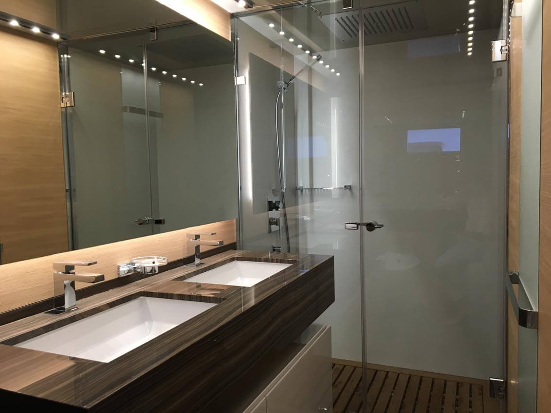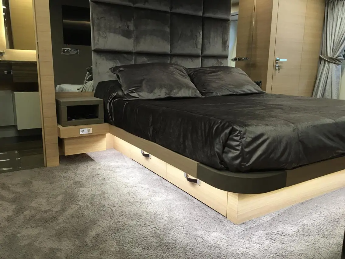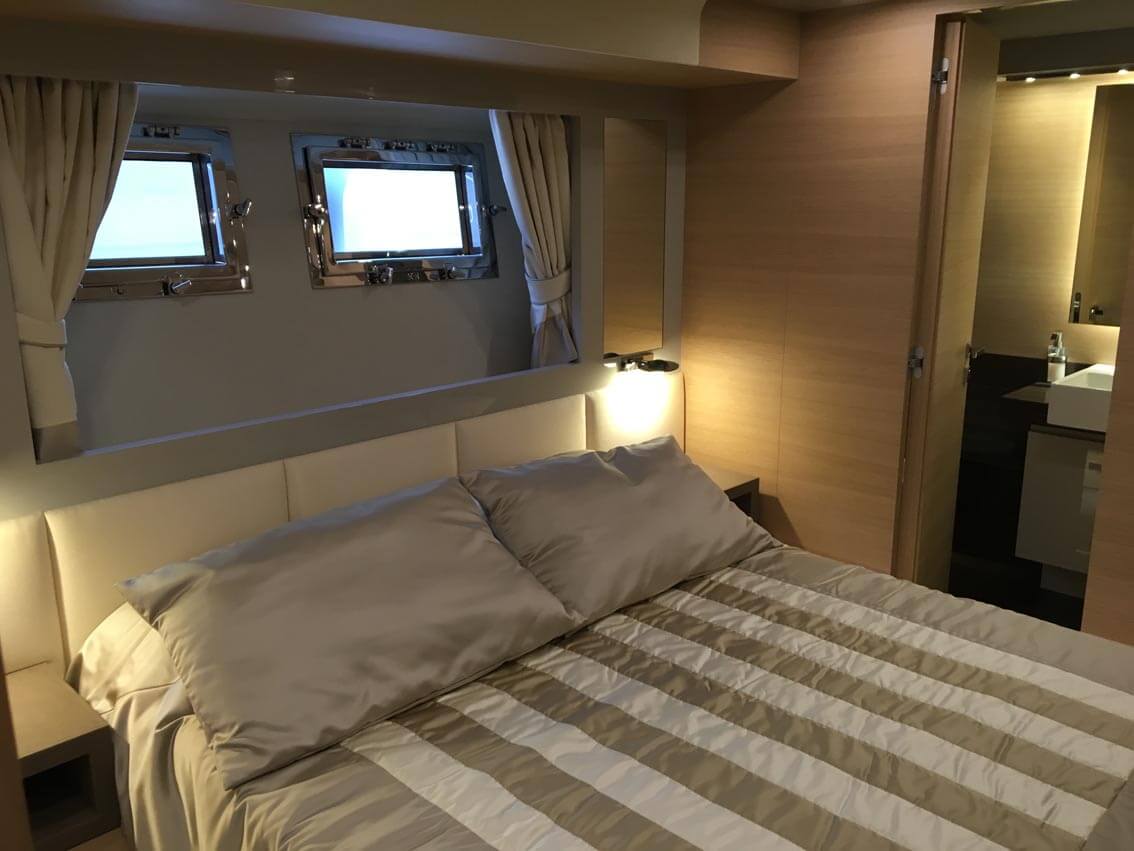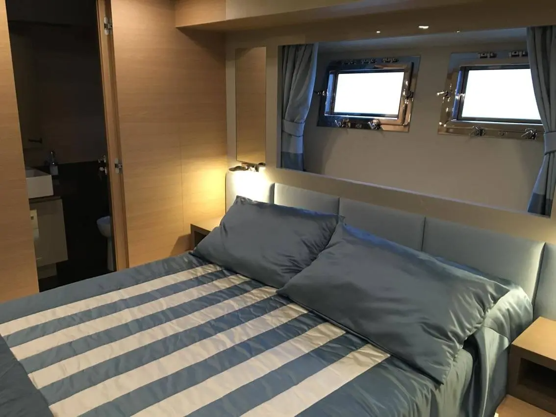 The accommodation sleeps a maximum of 8 guests over 4 en-suite cabins: 1 Master suite, 2 VIP staterooms and 1 twin cabin. ~ All accommodation is located on the lower deck, with the Master suite amidships to make use of the full beam. The interior is furnished with and aft-facing double bed with a widescreen TV on the opposite wall, a sofa to starboard with a walk-in wardrobe forward and a desk to port with the en-suite bathroom forward. The en-suite bathroom is fitted with a toilet, bidet, sink and large shower. ~ The VIP staterooms are aft of the Master suite and placed to port and starboard respectively. The double beds are in the centre of the room facing inwards, with a walk-in-wardrobe forward and the aft en-suite bathroom containing a toilet, sink and shower. ~ The twin cabin is placed forward of the Master suite and features two double beds with a sauna/shower to port and an en-suite bathroom to starboard containing a toilet, bidet and sink. ~ The crew of 3 will provide first-class service to all guests throughout their time on board.