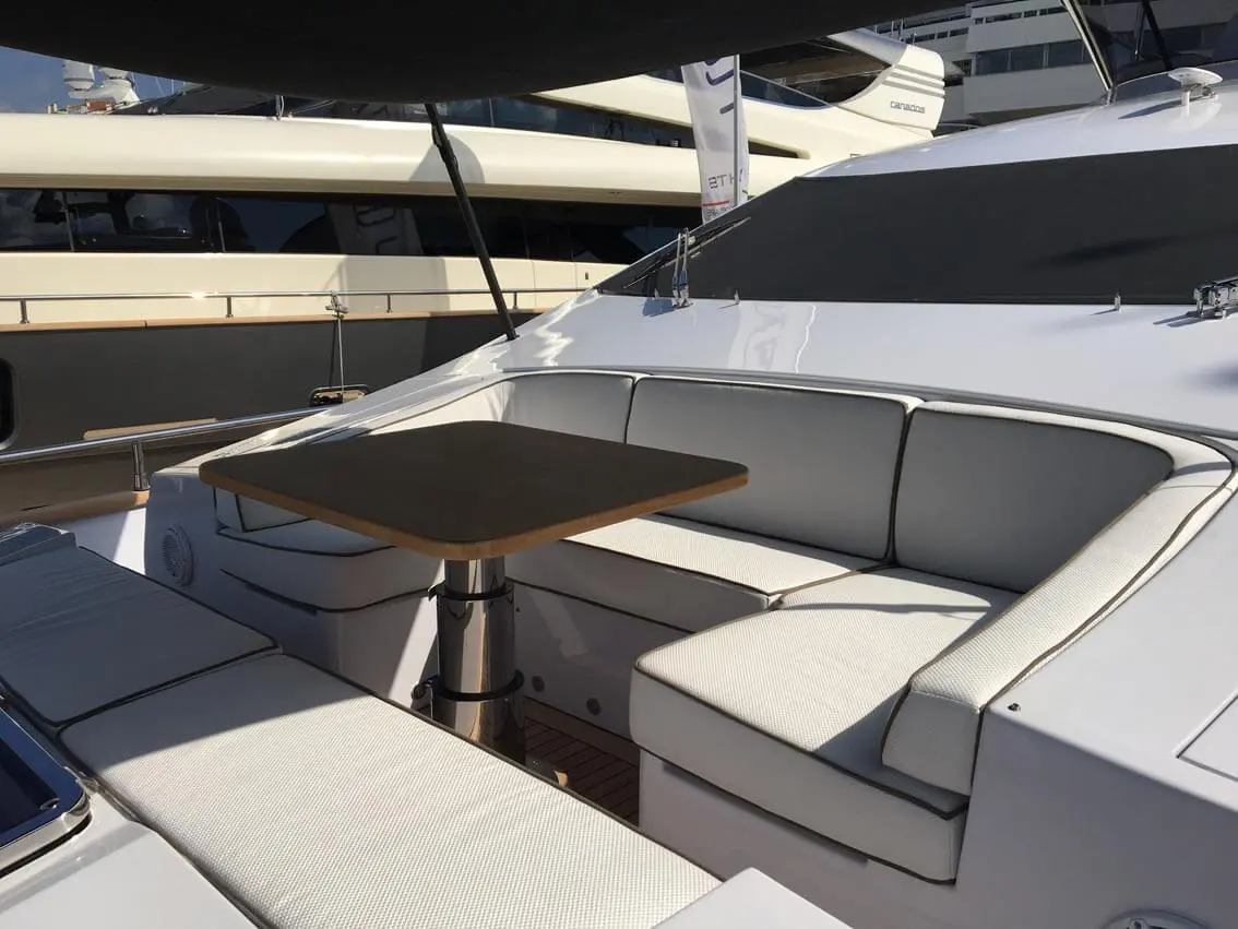 The flybridge is lined around the perimeter by plush padding that acts as a sofa along the port and starboard sides, a deep sofa/sunbed aft and a sunbed forward. The roof cover can be removed to expose the area to the sunshine, or shade guests as desired.