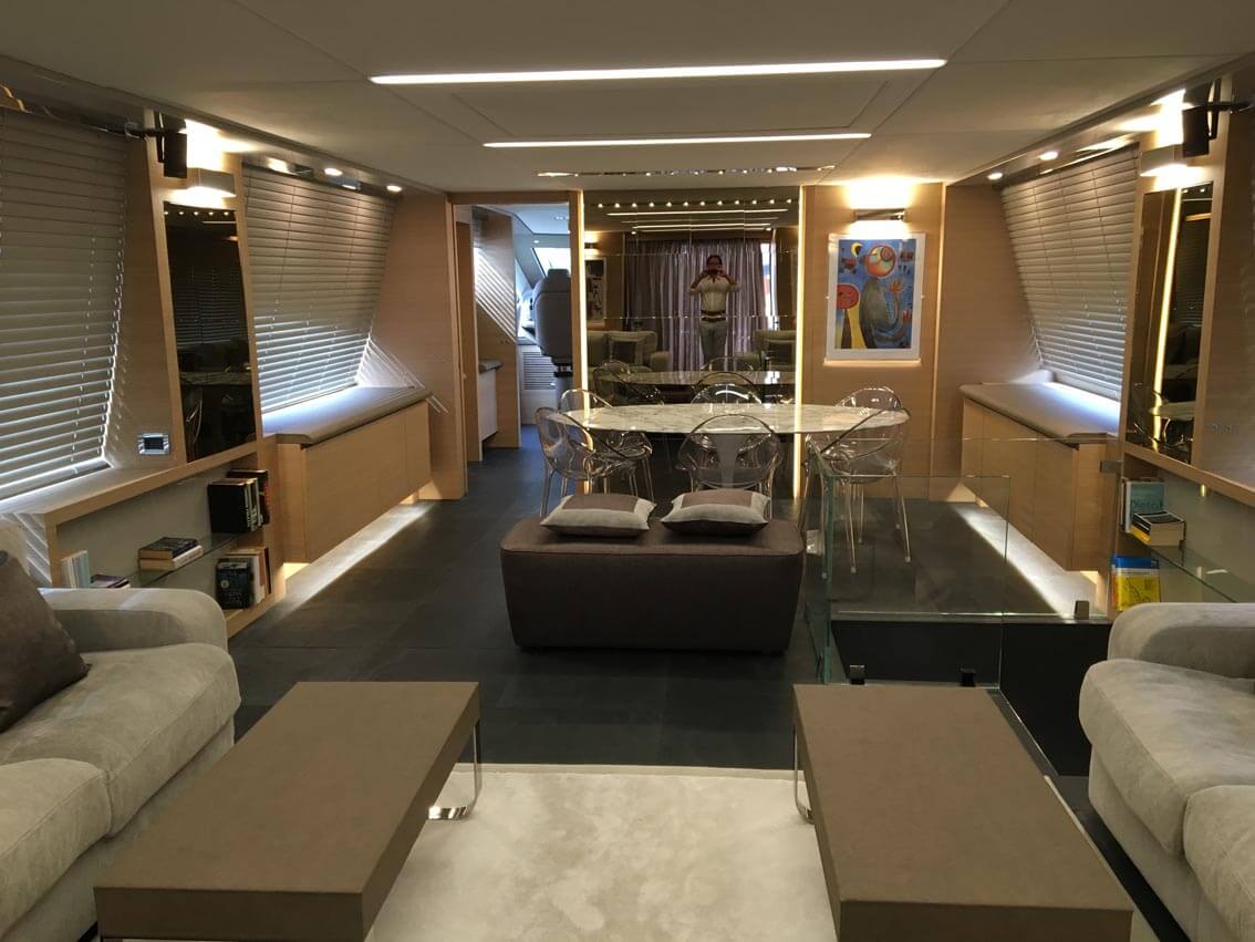 A forward staircase leads from the crew area up to the main deck, where the helm controls are placed to port and the starboard section is fitted with a U-shaped sofa around a raised drinks table for casual meals and resting personal items while savouring the sunshine. Behind is the galley and then the eight-person dining area. A staircase here leads from the guest accommodation into the salon, which is a symmetrical setting furnished with a forward-facing L-shaped sofa on both sides of the room, plus a coffee table.