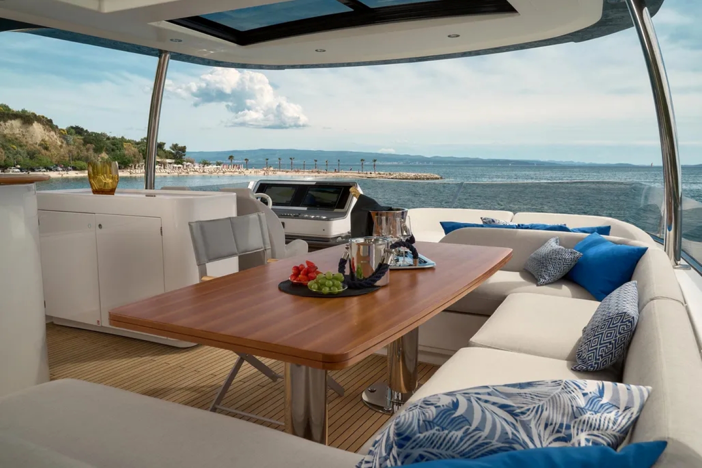 Given her status as a flagship flybridge Azimut yacht, the flybridge deck is truly impressive. Guests can enjoy wide, open views from the stylish lounge and dining areas and enjoy a cold drink while relaxing at the bar. The on-deck helm controls allow the captain to interact with the guests. Stepping down the beautifully crafted solid stairs onto the aft deck gives guests the opportunity to dine al fresco in luxury. The teak decks, soft and neutral furnishings and seamless access to the main salon ensure guests can enjoy time with friends and family.