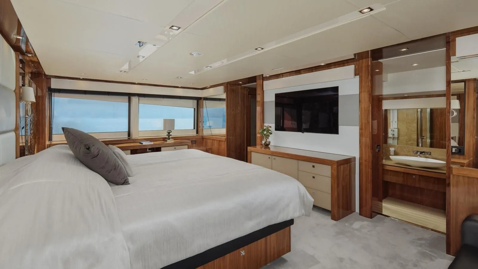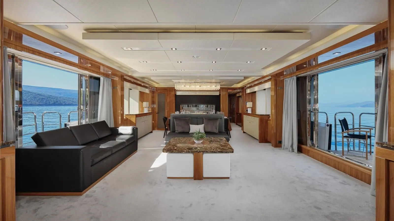 The beautiful interior features luxury finishes including gloss wood, marble tables and leather sofas giving the yacht a contemporary and stylish atmosphere. The main salon is configured with a lounge and dining setting forward plus connects seamlessly with the surroundings with a fold out balcony. There is also a unique Wessell, Nickel & Gross Player Piano, a sophisticated piano offering live or automated performances
