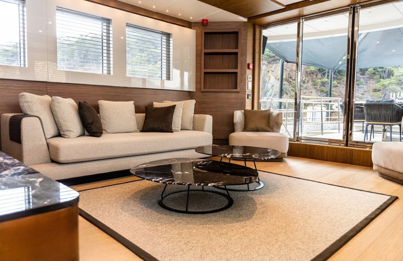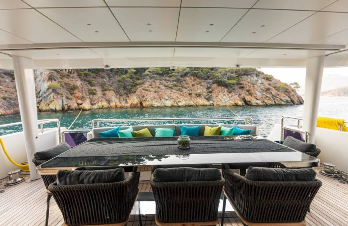 The main deck aft is shaded by the upper deck overhang, leads directly into the main salon and down to the swim platform which can be further extended with an inflatable platform.
