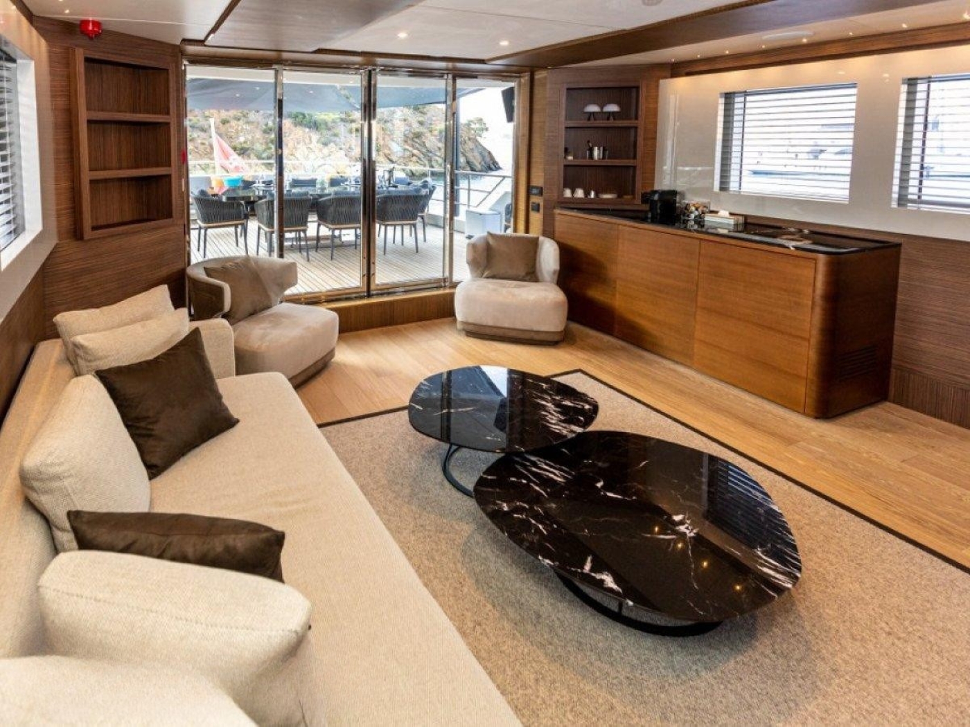 The interior décor is very stylish with hints of mid century modern in a soft neutral colour palette. The main salon features a long sofa and occasional chairs around a coffee table aft and a dining setting forward. Amidships on the main deck is the well-equipped galley while the forward position is filled with the main deck mater.