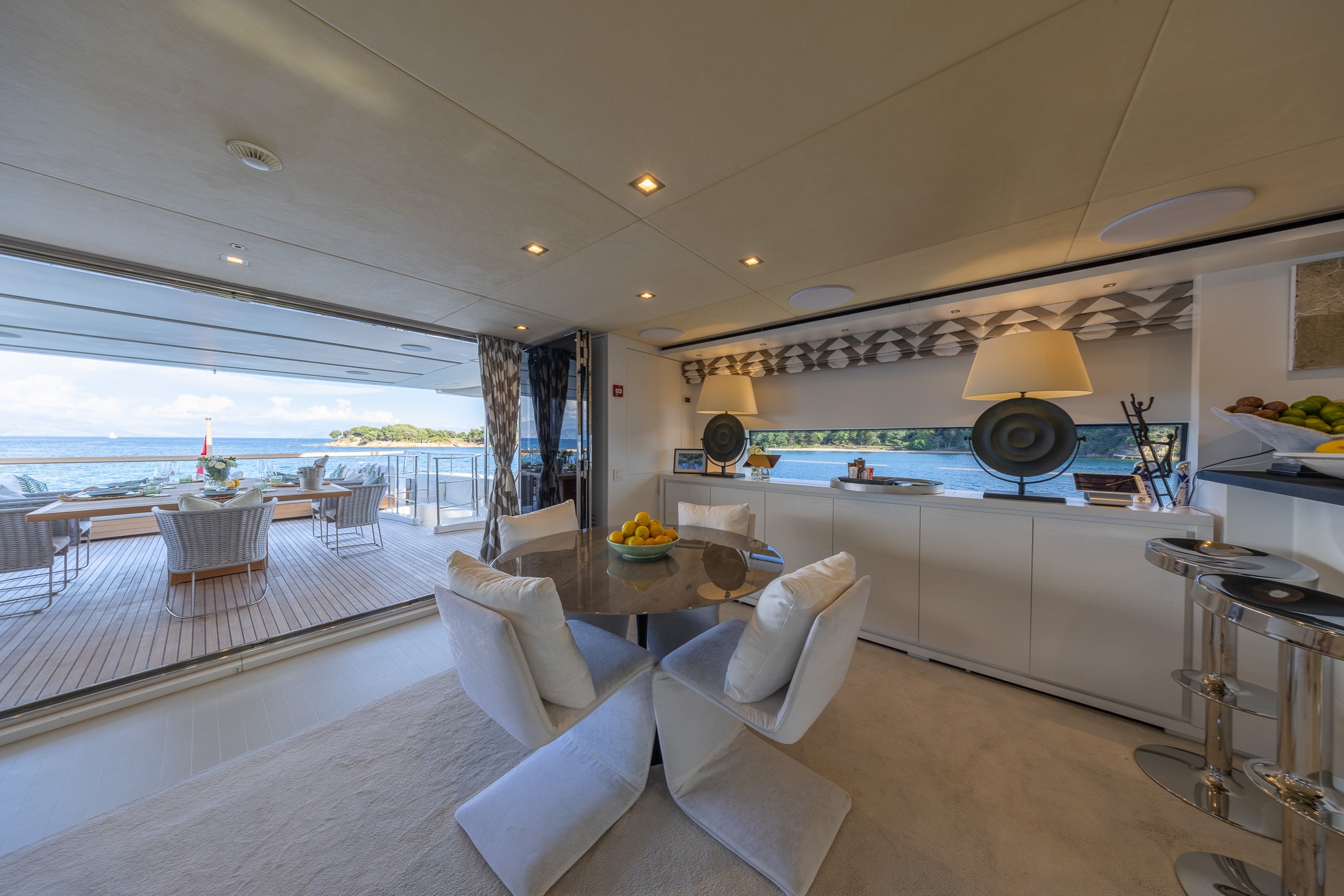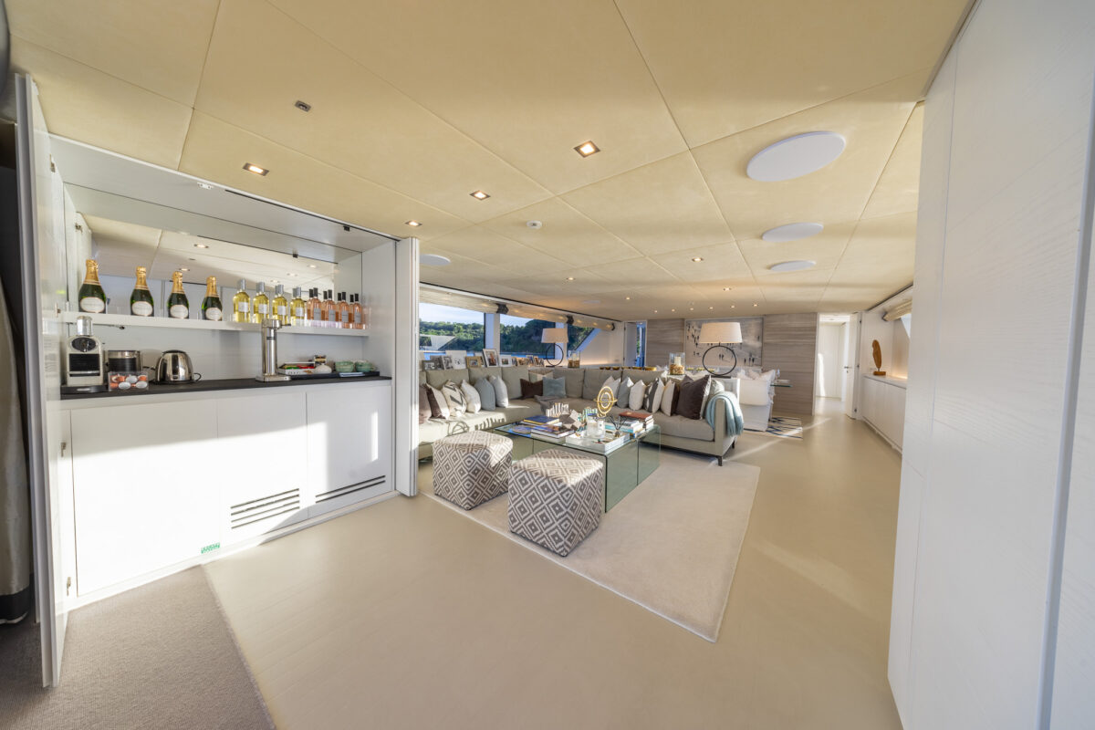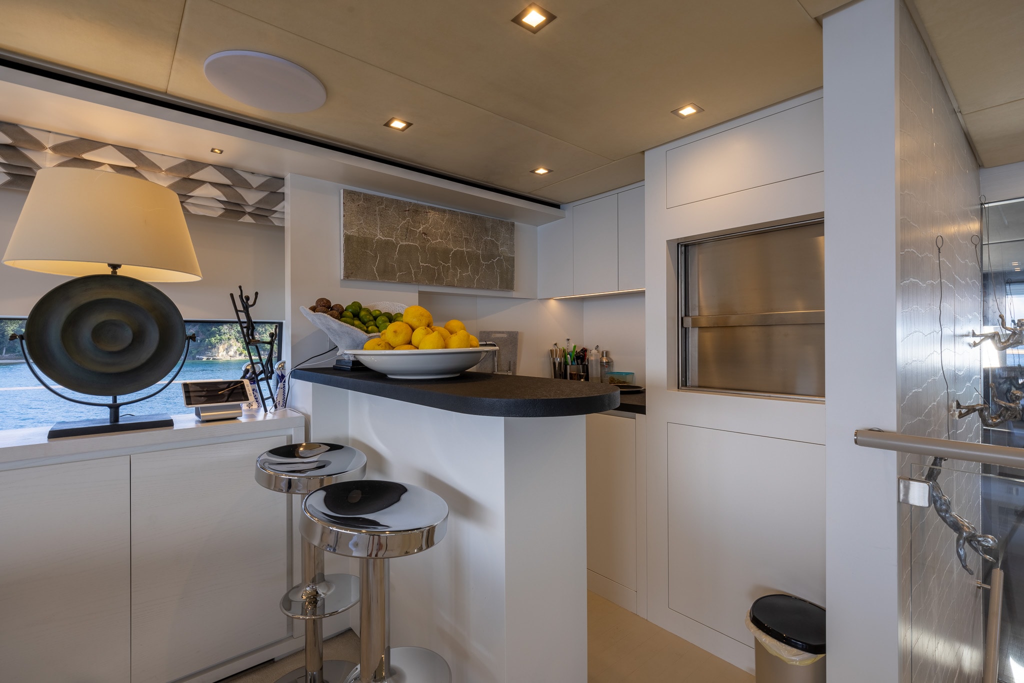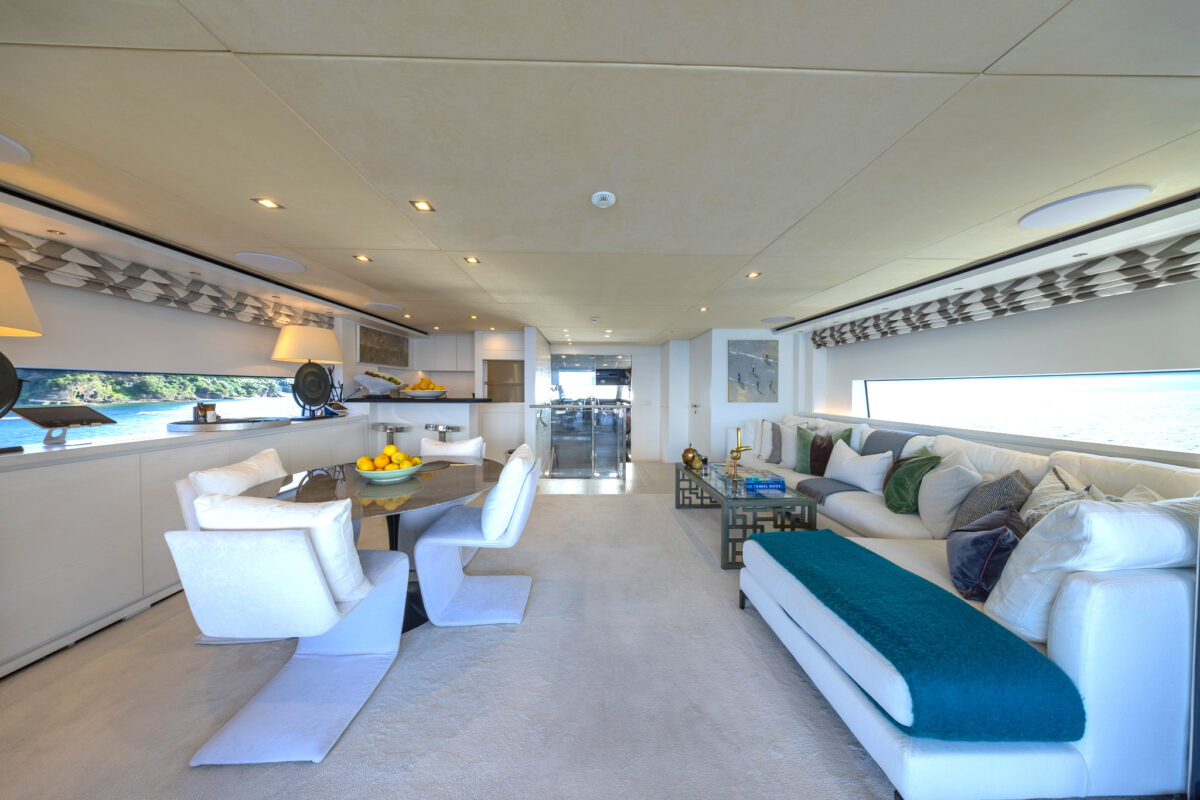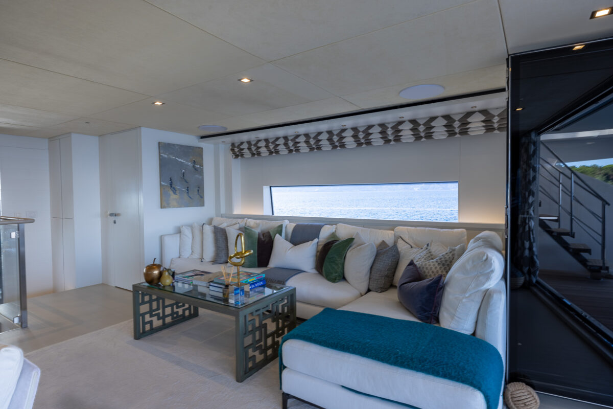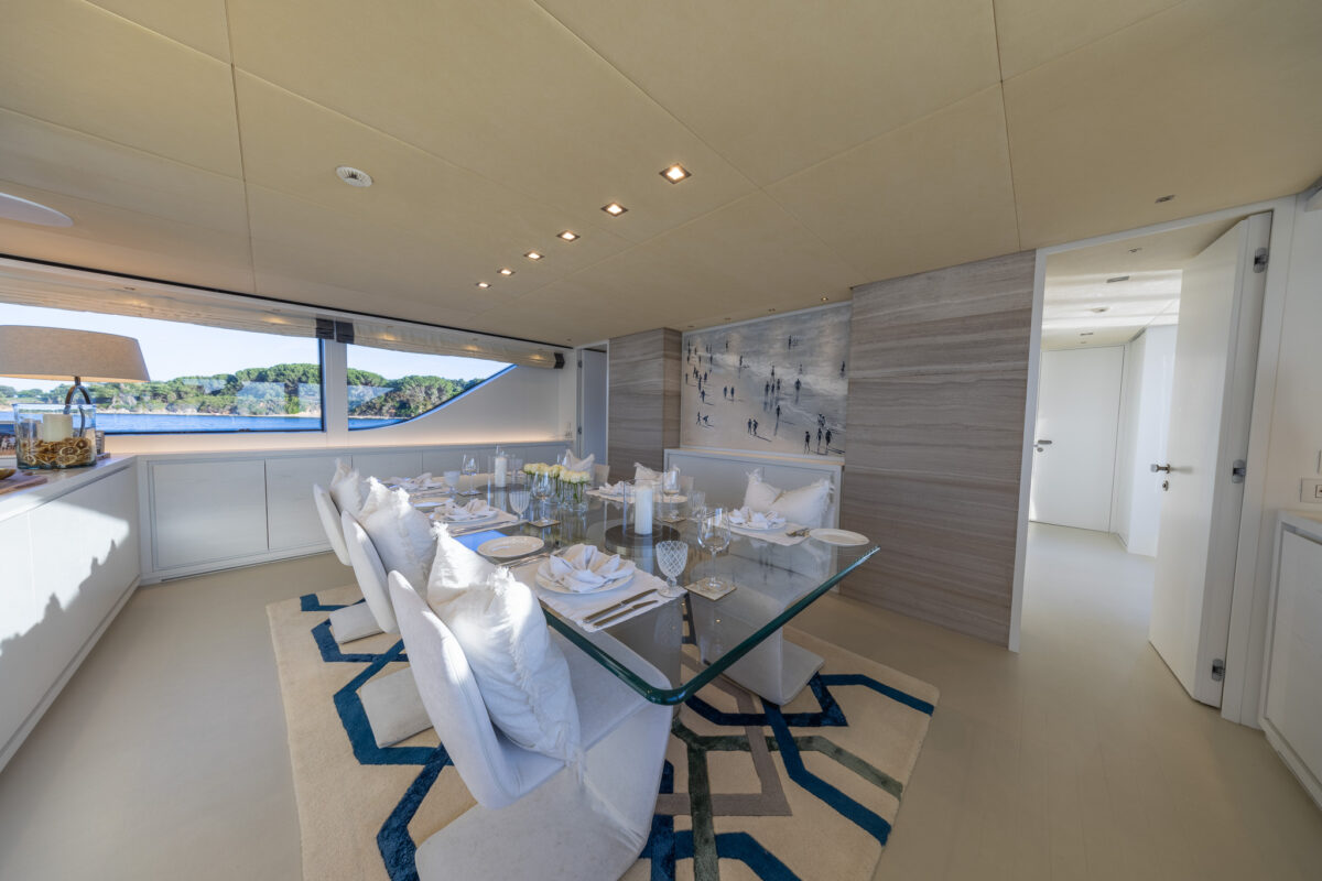 The interior benefits from both a sky lounge and main salon offering plenty of space for guests to spread out. The main salon is configured with a lounge aft and dining setting forward: the lounge has a comfortable corner sofa, stools and a coffee table, while the dining area can seat up to ten guests at a stylish glass table. The neutral décor and expansive glazing ensure the space is light, airy and welcoming for guests.